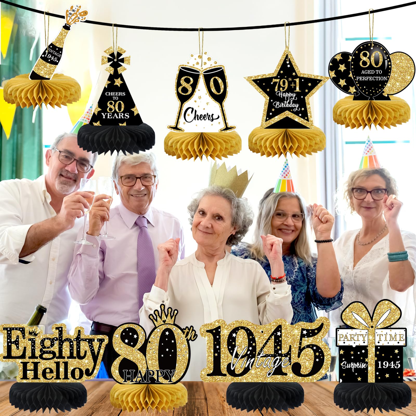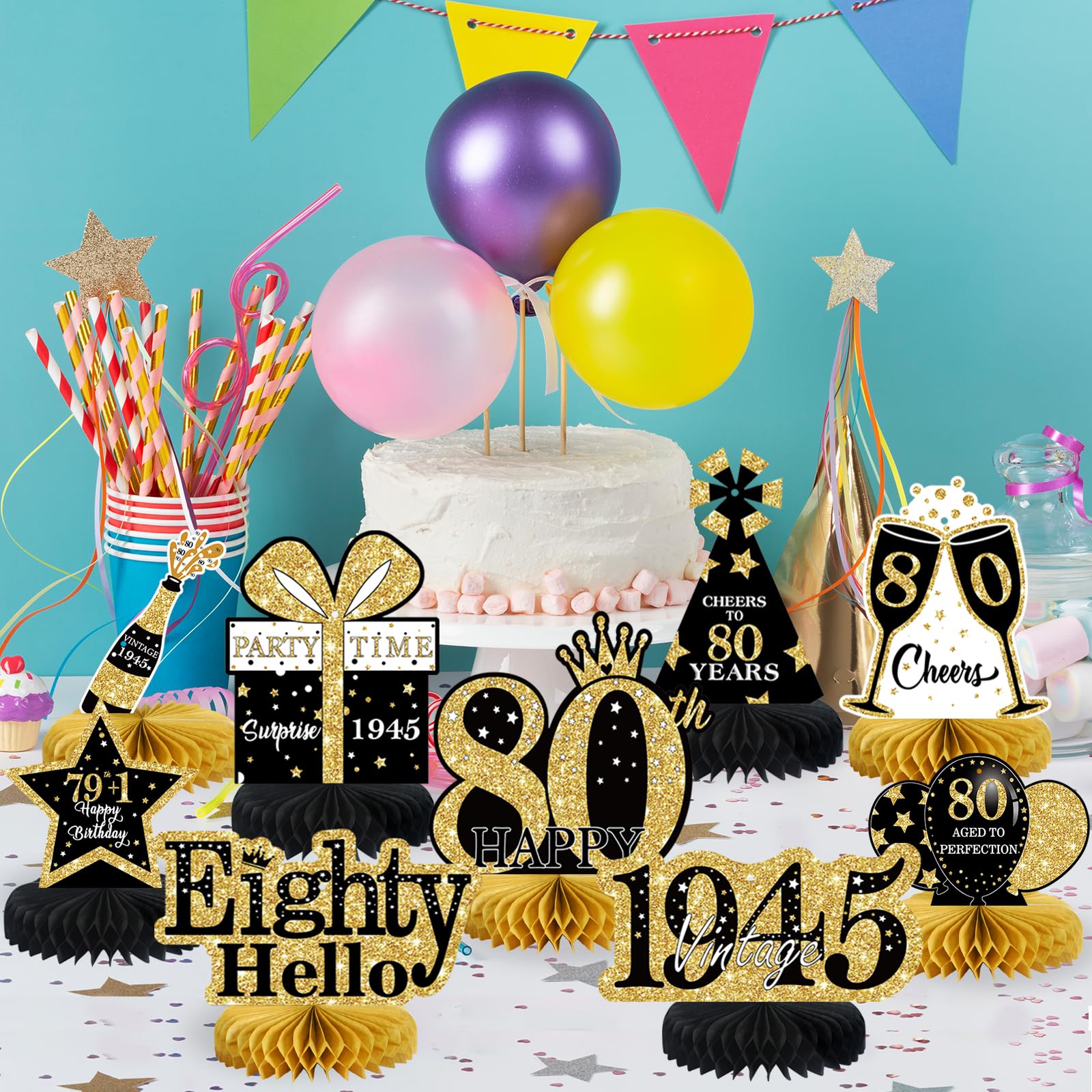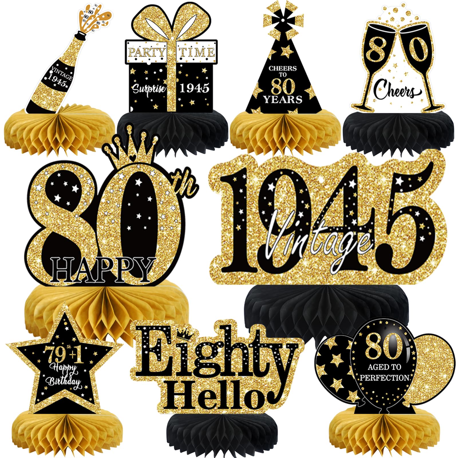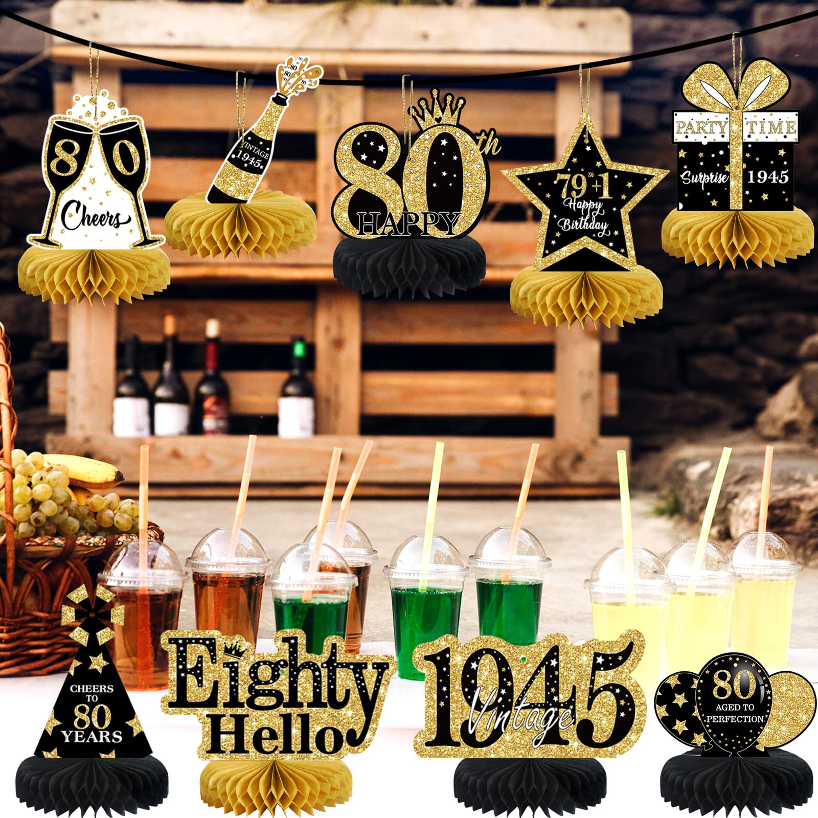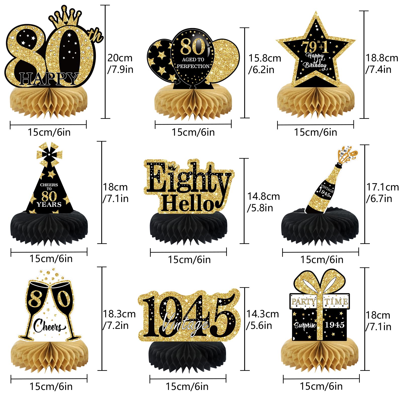 [You will get] - 9 pcs black gold 80th birthday decorations honeycomb table centerpieces for women men, it contains 9 patterned cardboards and 9 paper honeycombs (4 black and 5 gold),and matching lanyards.These chic 80th birthday table decorations are enough to decorate your themed party.