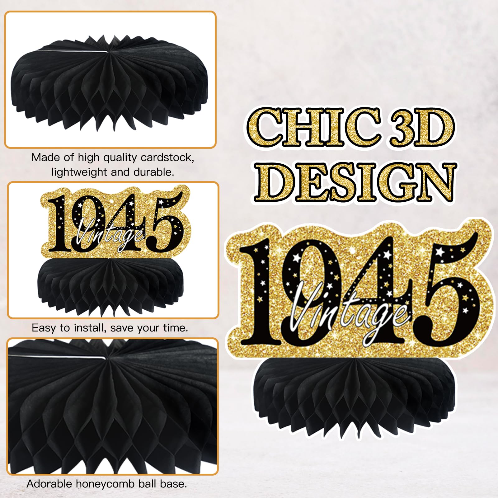 [80 years old theme] - The 80th birthday table centerpiece decorations adopts double-sided printing and retro black gold design, and the surface is printed with many related elements, such as Surprise 1945, Vintage 1945, Hello Eighty and other text and balloons, stars and other patterns.