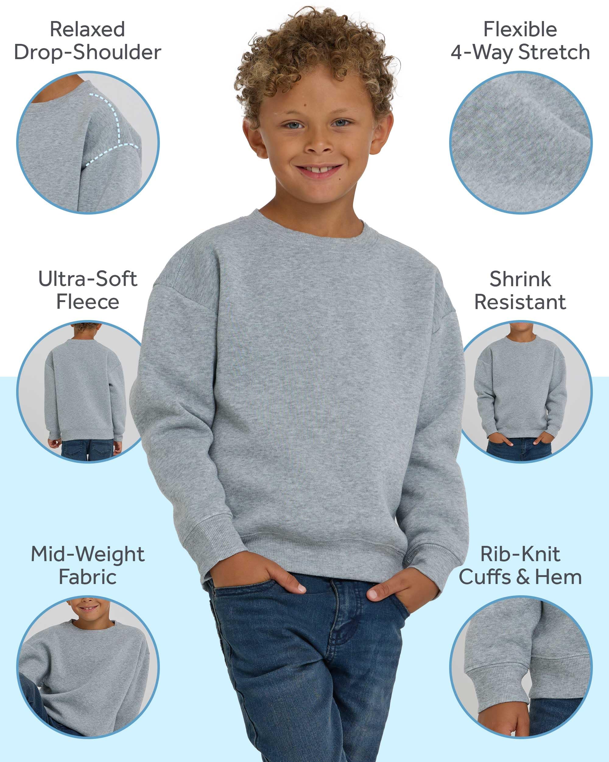 Soft And Comfortable All-day Fit: Made From 100% Polyester, These Mid-weight Boys Sweatshirts Feature Super Soft Fleece Fabric And A Relaxed Drop-shoulder Fit, These Crew Neck Sweatshirts Designed To Keep Kids Cozy Without Feeling Bulky. The 4-way Stretch Material Moves With Your Child, Making It Ideal For Sports, Outdoor Activities, Or Just Staying Comfy At Home.