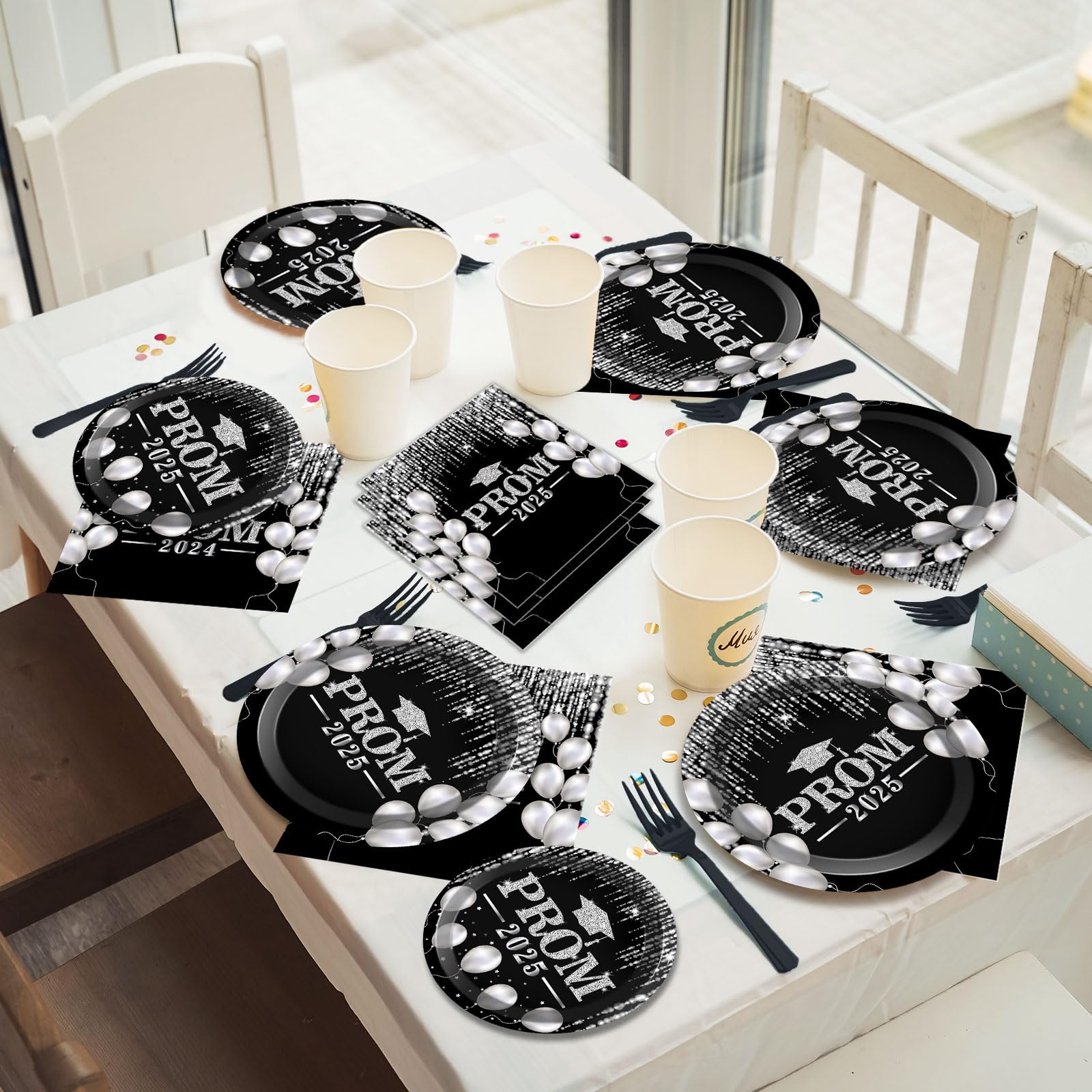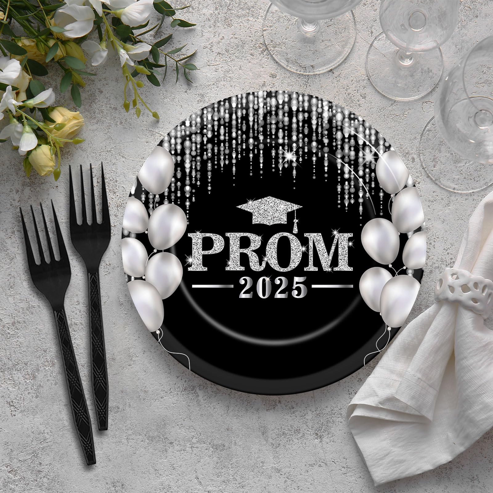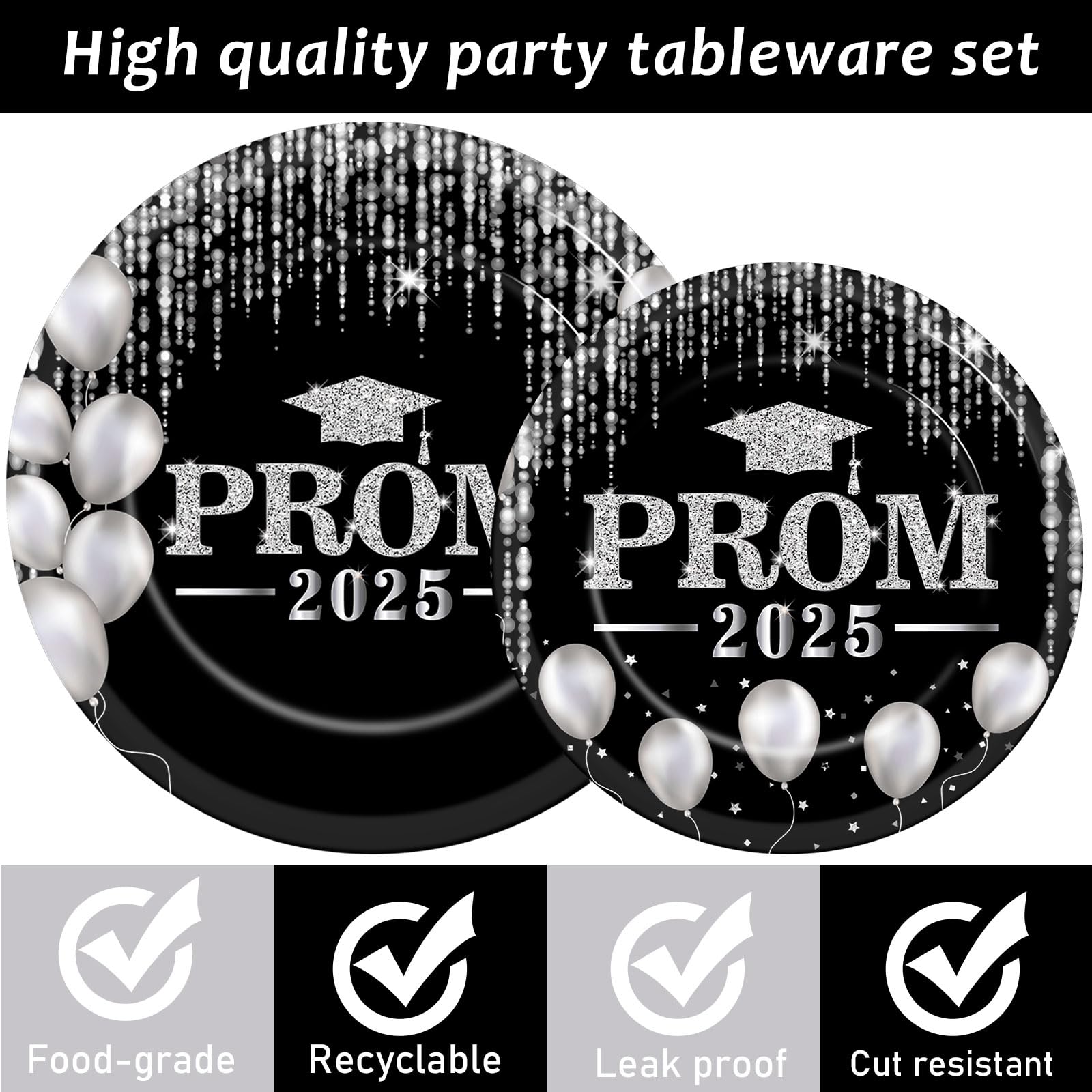Exquisite Patterns:This prom night 2025 theme party dinnerware set is printed with silver balloon,graduation caps and shiny design,has Prom 2025 written on it.Simple black and silver make the whole party look advanced and layered.It is a great choice to add a different color to party.