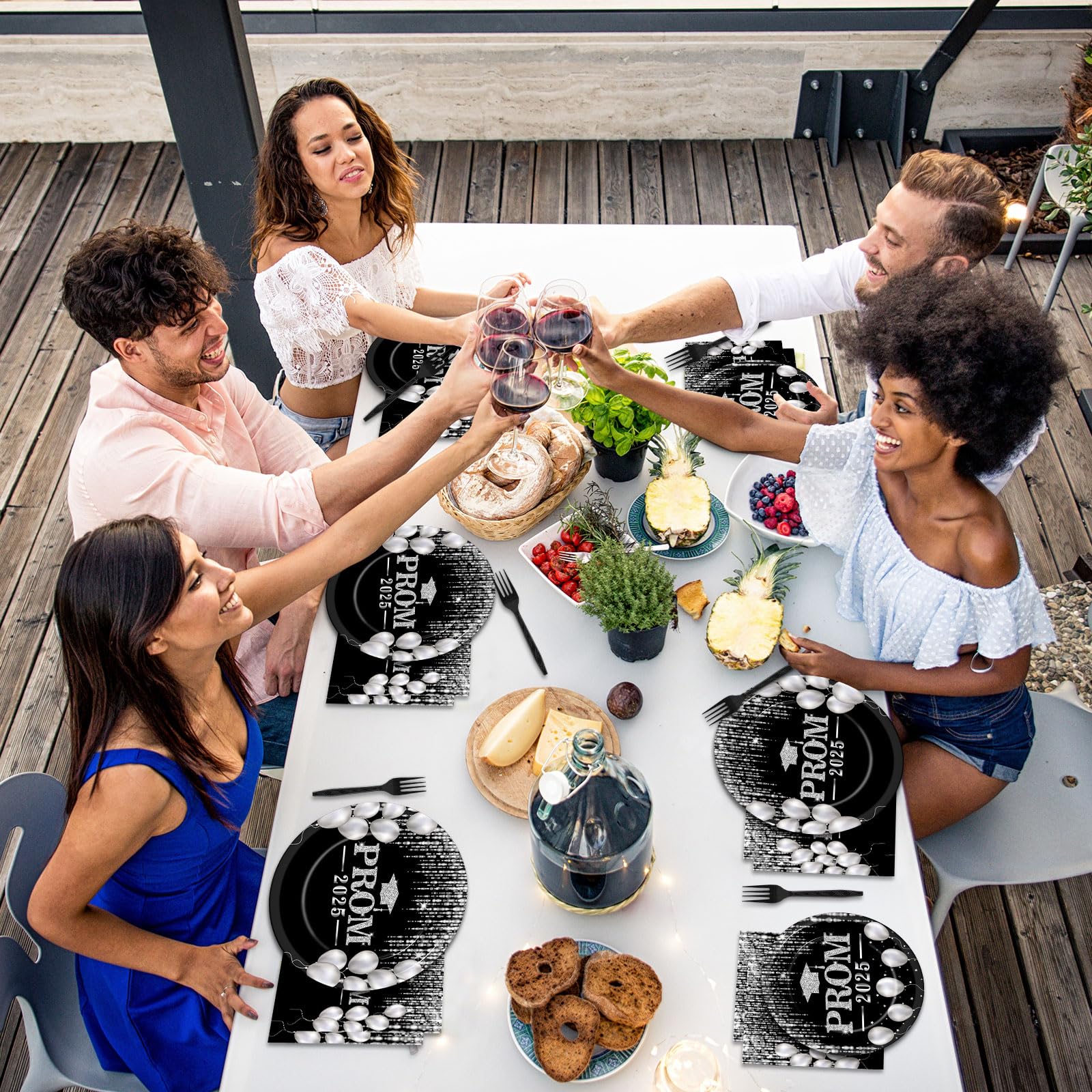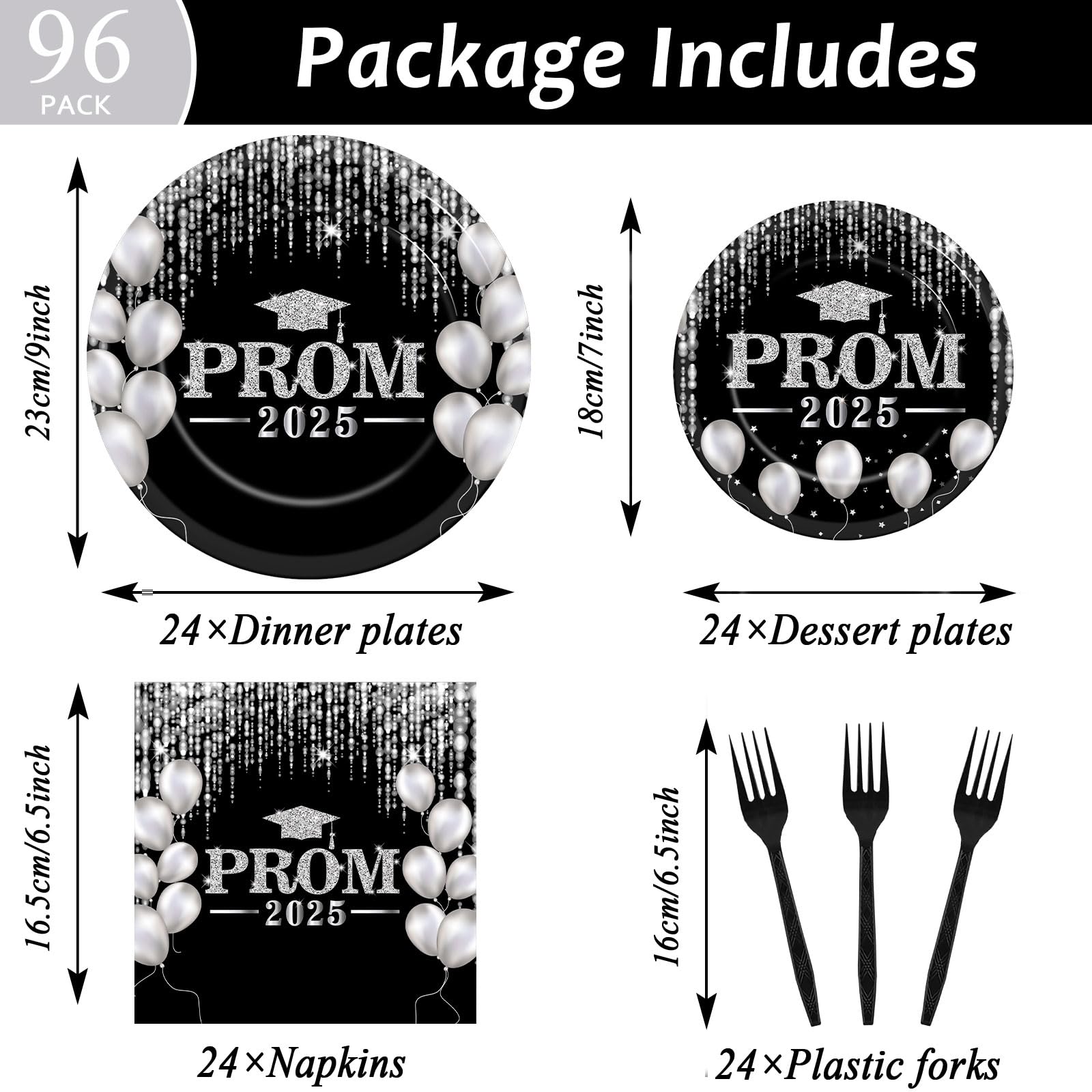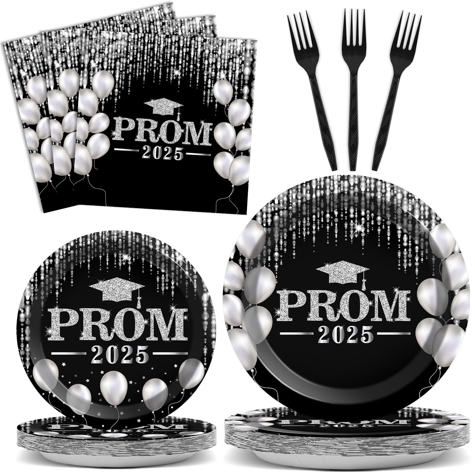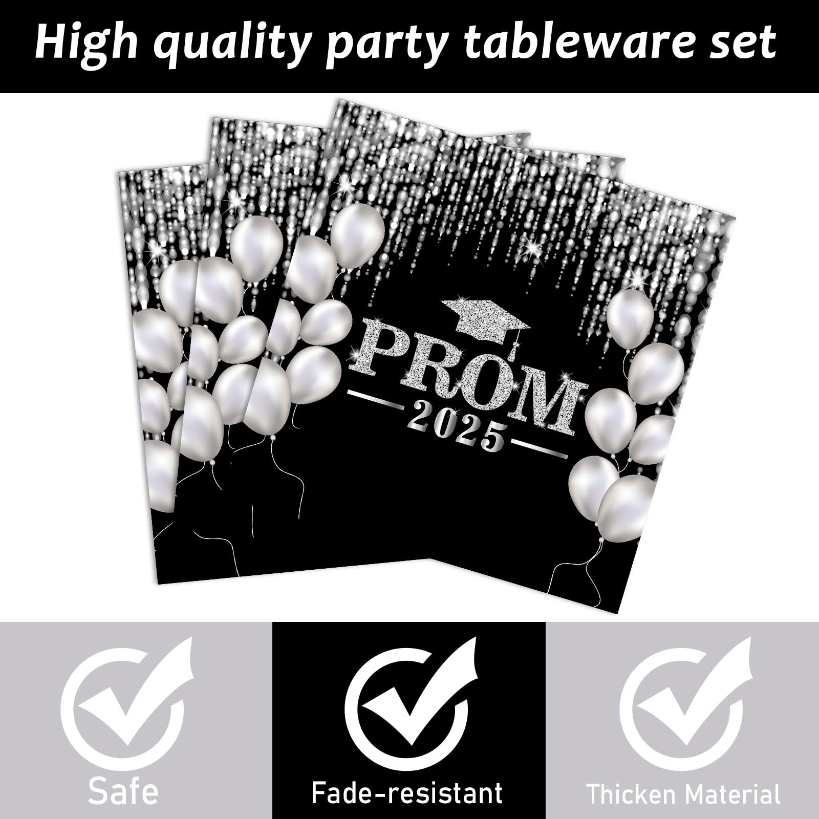 Exquisite Patterns:This prom night 2025 theme party dinnerware set is printed with silver balloon,graduation caps and shiny design,has Prom 2025 written on it.Simple black and silver make the whole party look advanced and layered.It is a great choice to add a different color to party.