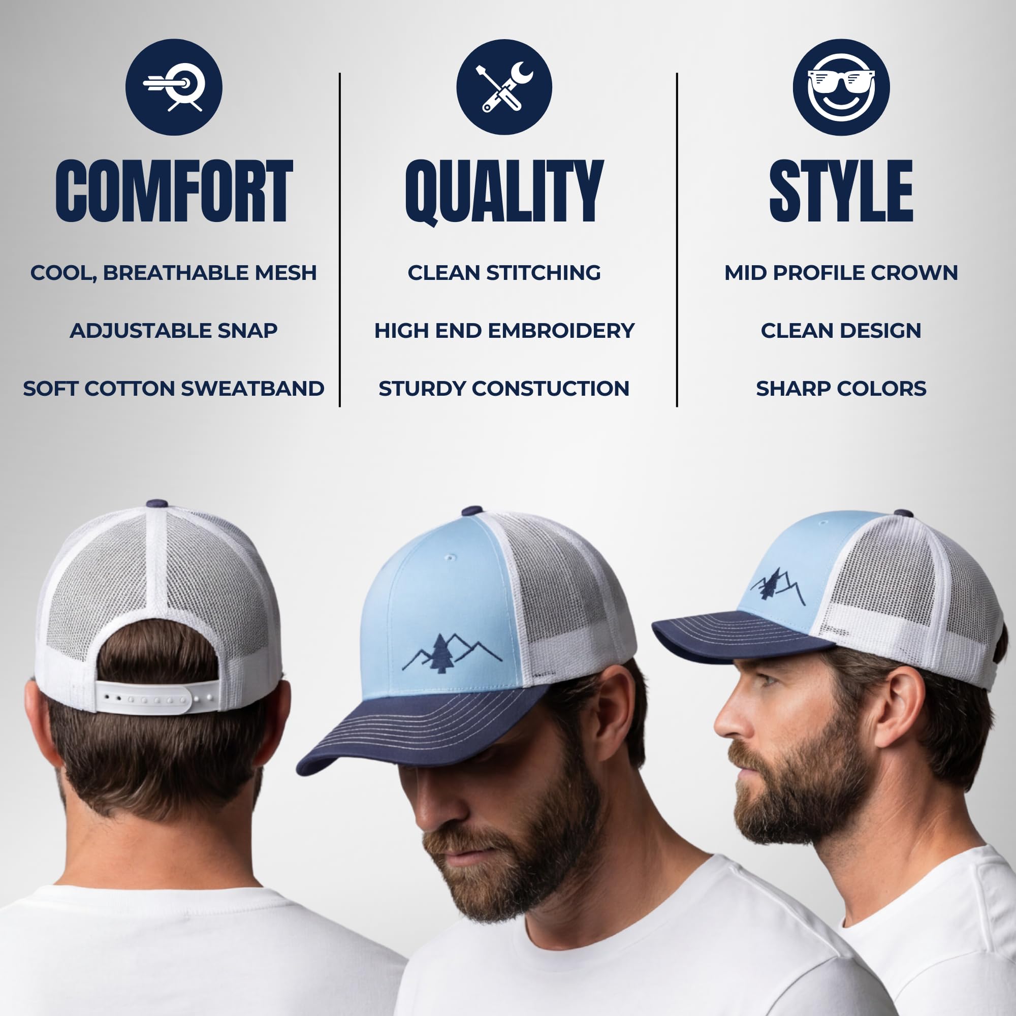 SIMPLE DESIGNS & NO CORPORATE BRANDING: Our philosophy is to provide hats that celebrate the outdoors, not our company; Because of that our name and logo will never be a visible part of any design only simple, clean graphics that celebrate an adventurous lifestyle