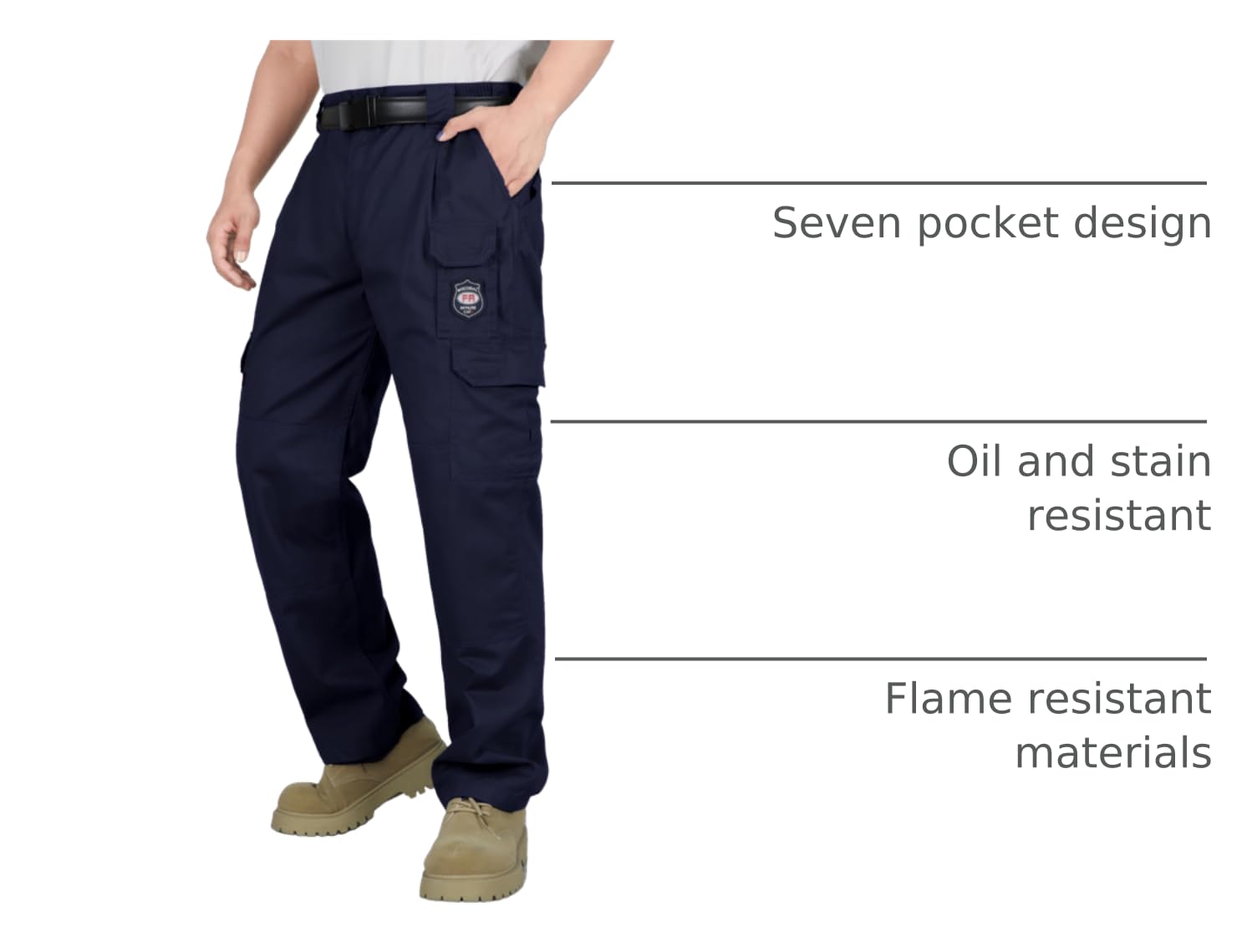 FASION AND COMFIT:This FR work Pant has 7 Pockets and elstic waist band, provides a Perfect and comfortable relaxed Fit.Also soft and fashionable.We did prewash/ preshrunk and wrinkle-free.Machine wash No shrink! Double needle stitching on outseam. Left and right cargo pockets at the thighs with flaps to keep items secure.