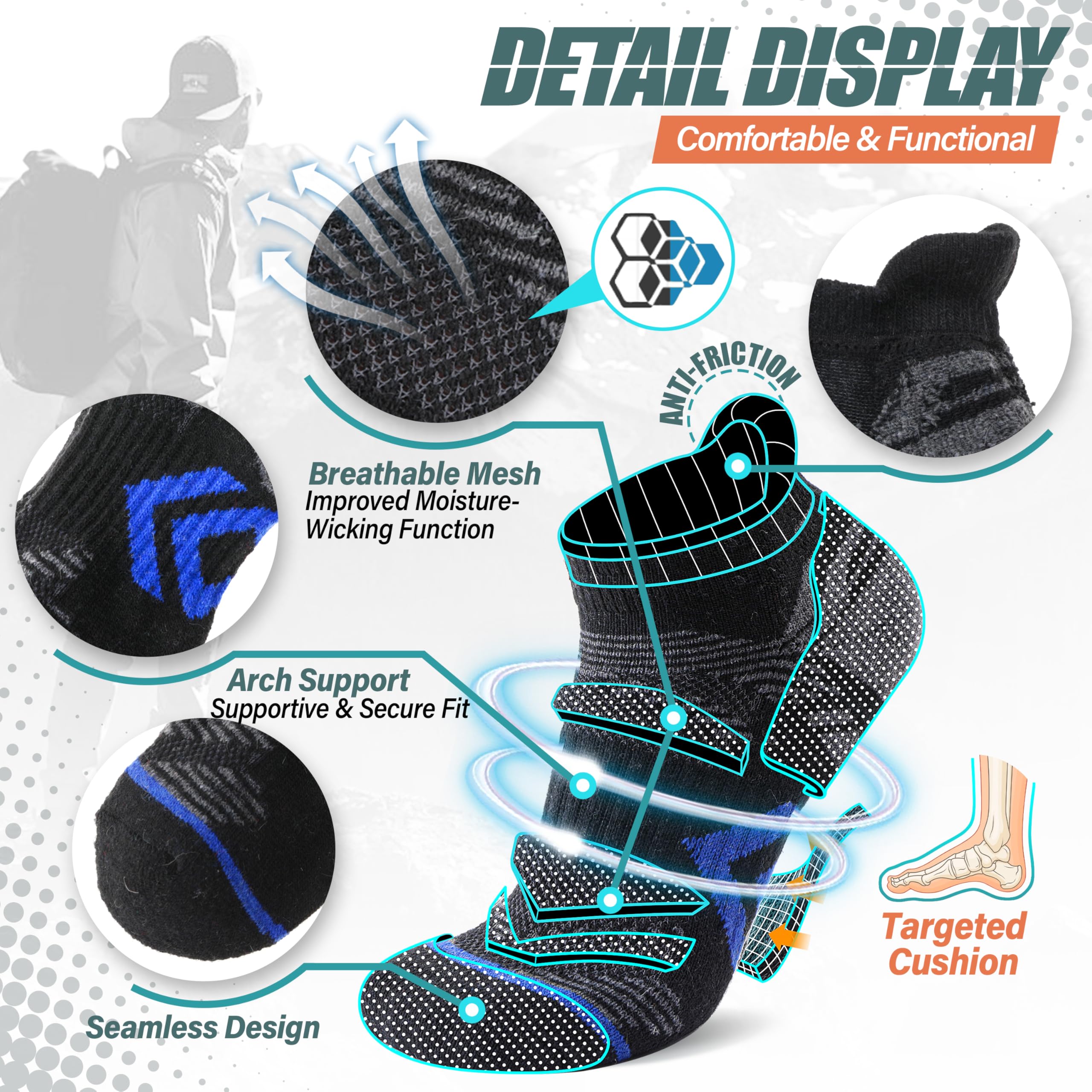 š GENTLE COMPRESSION SUPPORT ļ¼The hiking wool ankle socks incorporates a gentle compression support technology, and a compression stripe is designed on the ankle and the arch , so that the socks can protect achilles and keep the socks in place,It can also enhance blood circulation , relieve symptoms varicose , reduce fatigue and help in muscle recovery. They are perfect socks for hiking , climbing , running , walking or other outdoor activities.
