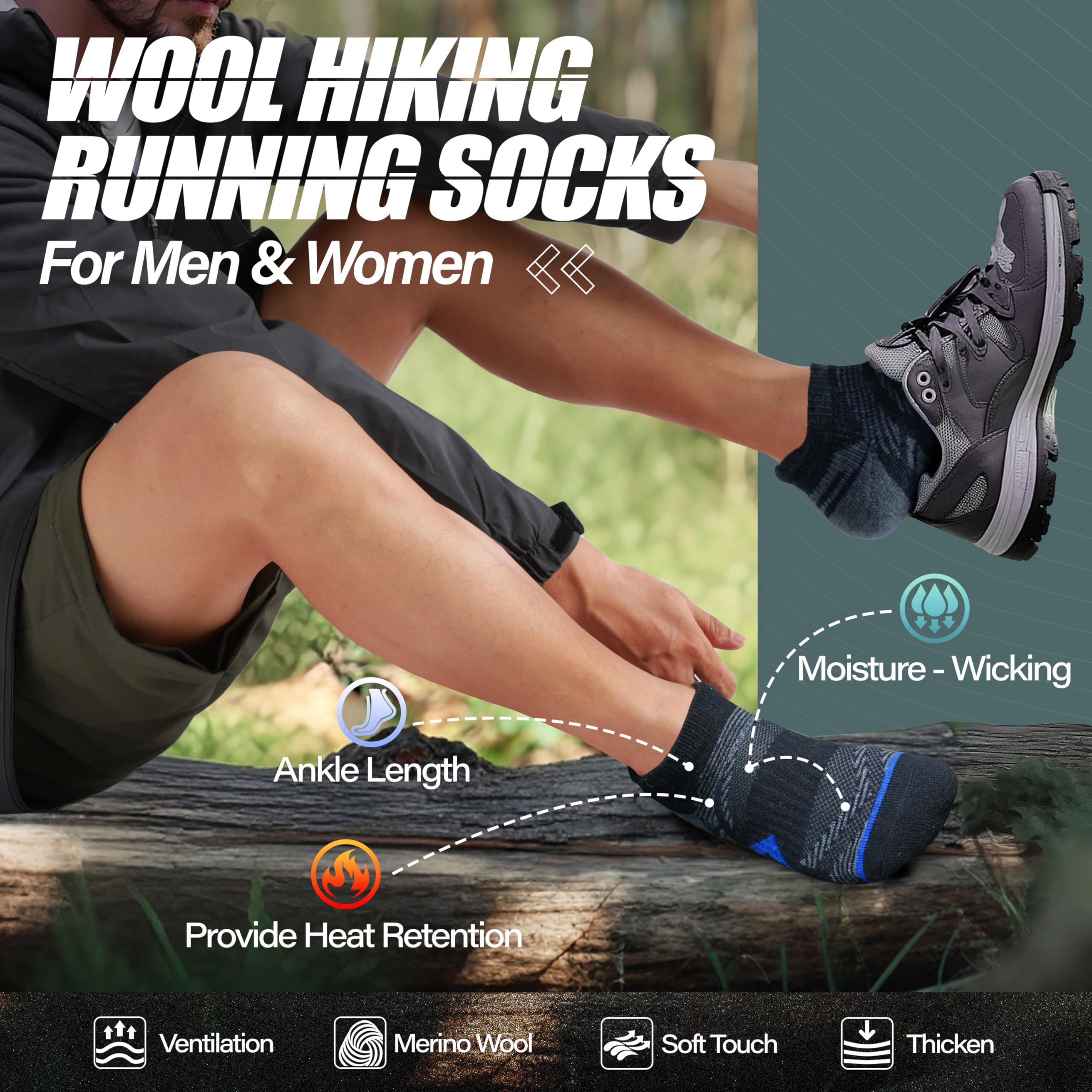 š MOISTURE CONTROL FABRIC: Made of 70% MERINO WOOL, 23% POLYESTER, 5% SPANDEX , 2% NYLON.The material of these wool hiking ankle socks are wear-resistant , durable , and temperature regulation.These thick socks for mens and womens feature excellent moisture control function, keeping your feet dry and breathable at all times , helping eliminate odor and preventing your feet from stinking.
