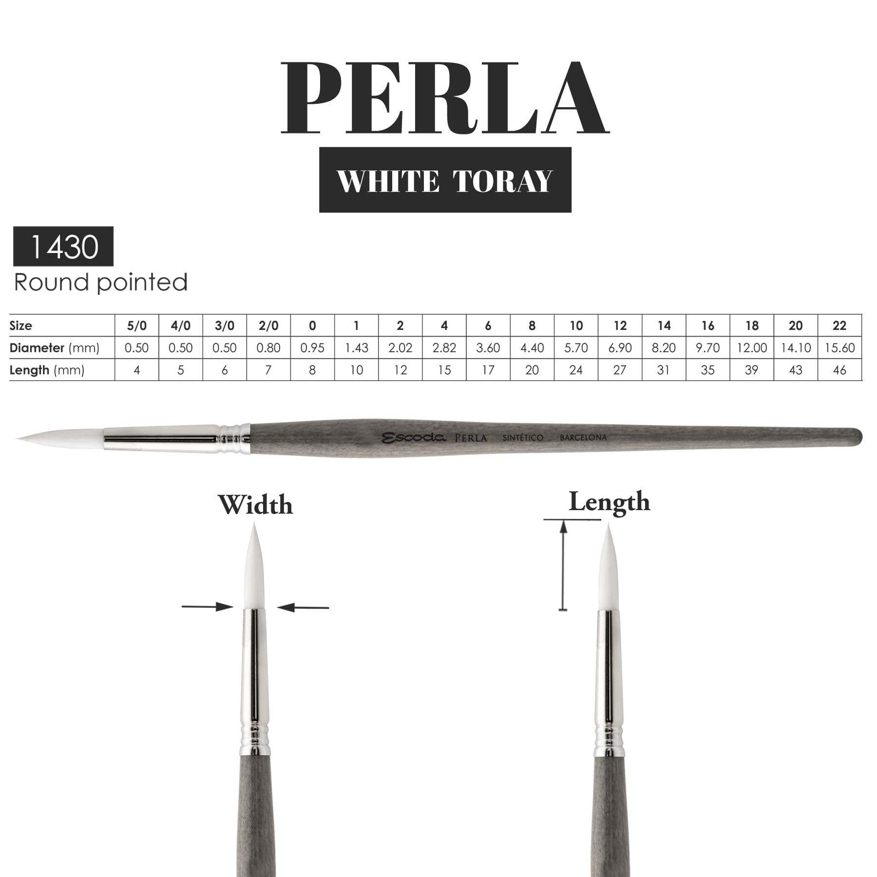 The Escoda Series 1430 Perla Brushes are made from a custom blend of patterned white toray synthetic filaments containing all the attributes of natural sable hair. A perfect choice for the professional or seasoned watercolor artist, this brush retains its perfect point after much use and has top notch color retention & spring. Escoda brushes continue to be made by hand by the Escoda family as they were since 1933. This is a short handle size 4 round brush with bristles measuring a diameter of 2. 82mm and length of 15mm.