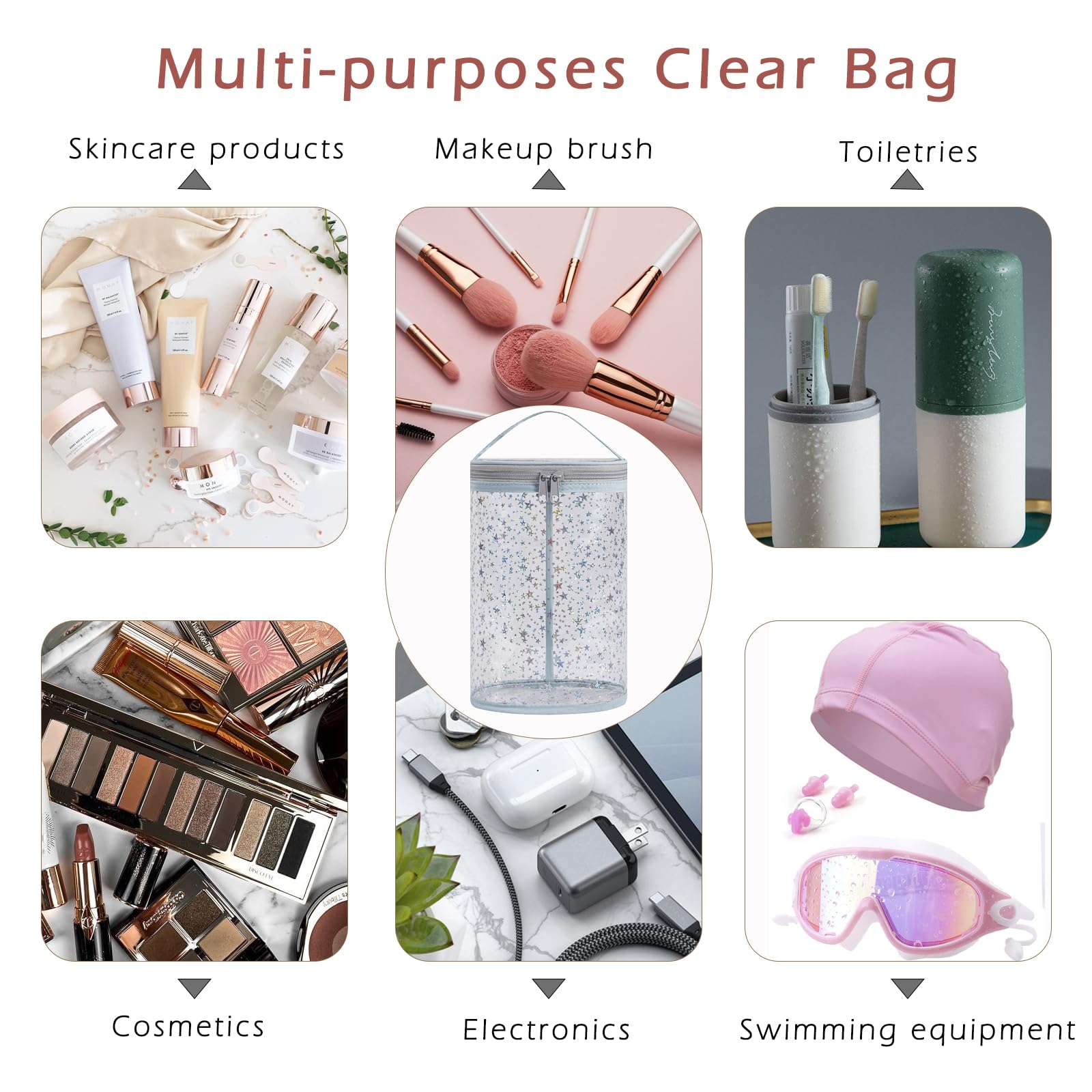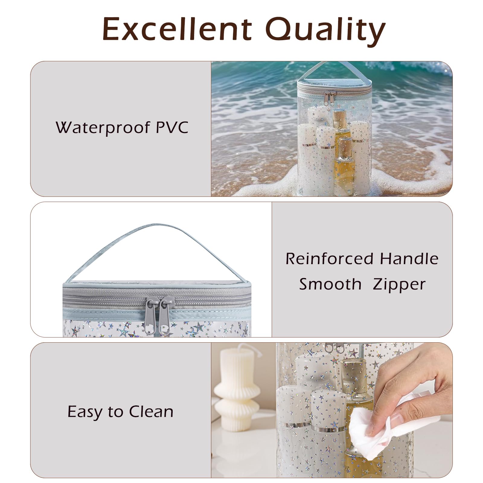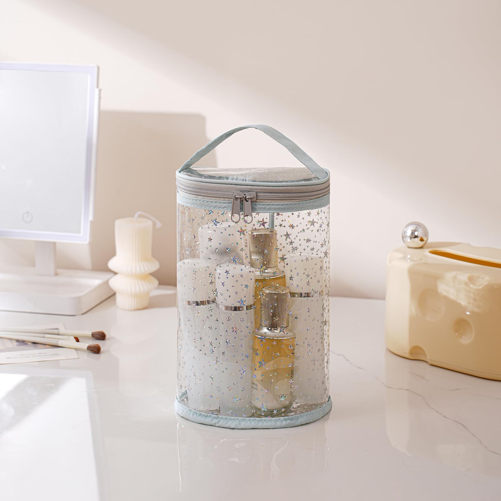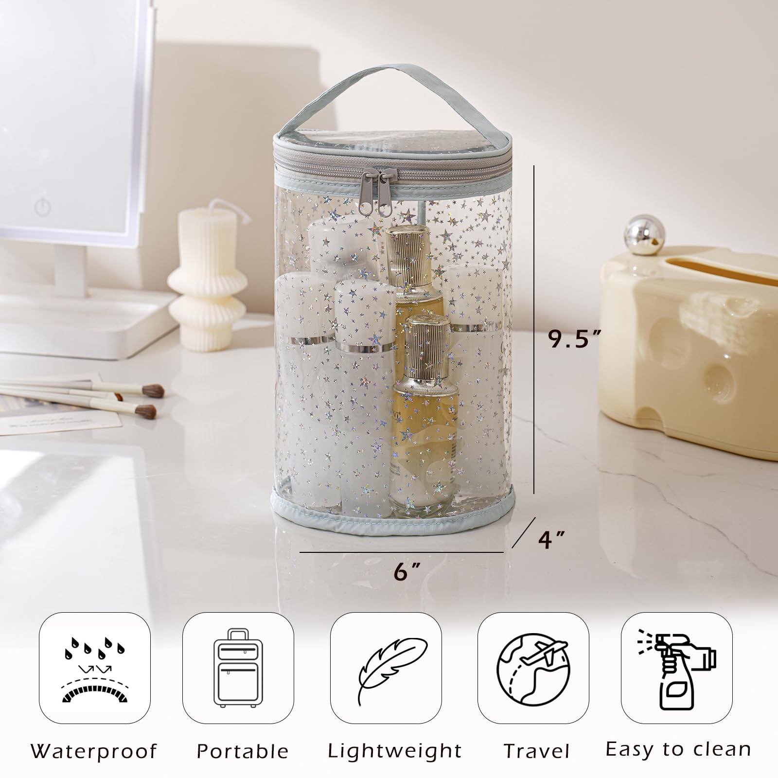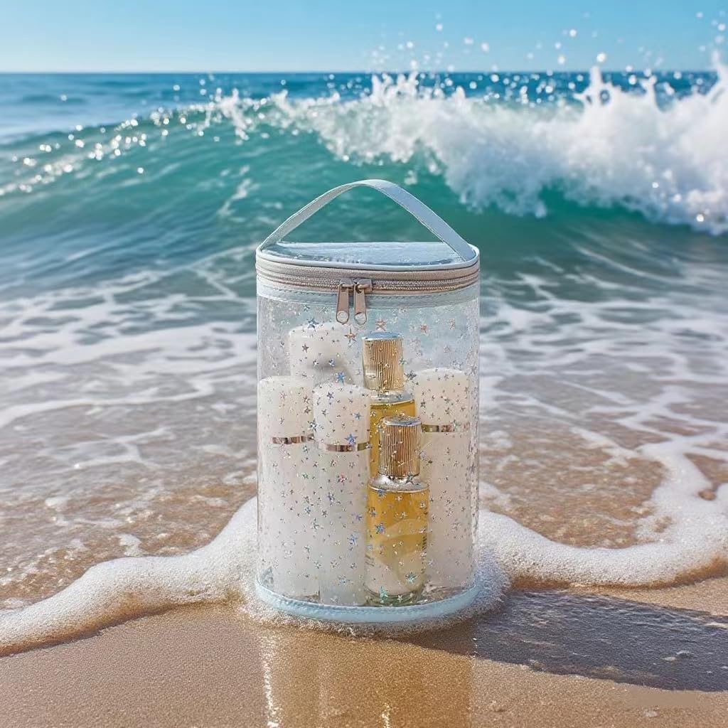 [Unique Design] Featuring a clear body with a charming star pattern, this bag combines fashion with function. The transparent look adds a modern, minimalist touch while letting you easily see what’s inside. Whether used as a makeup organizer, travel pouch, or beach accessory, it brings a pop of personality and elegance to your routine—making it as fun to carry as it is practical.
