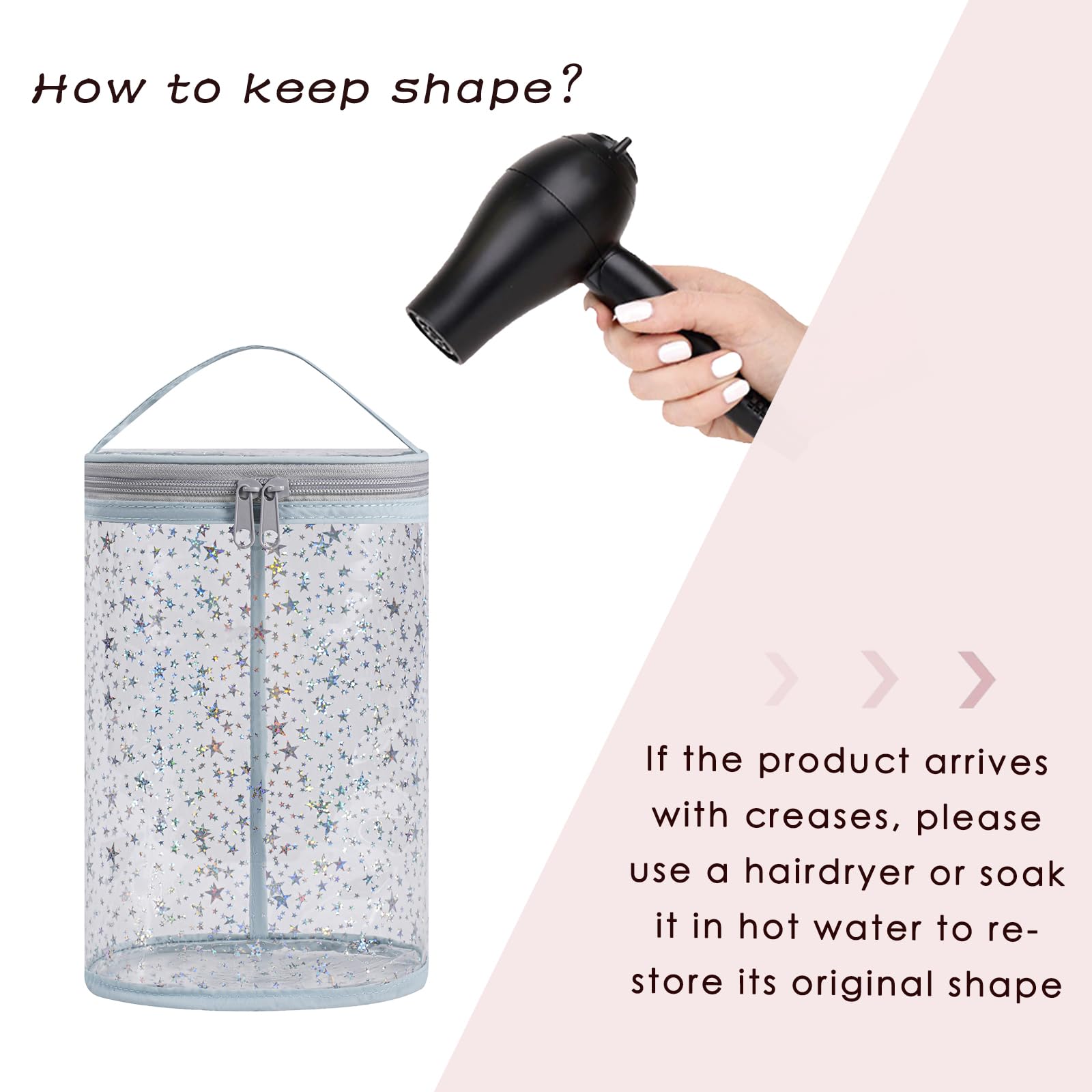 [Product Size] The dimensions of the Clear pvc Makeup Bag are: 9.5 inches x6inches x 4 inches. It’s lightweight design makes it easy to pack and carry with you on the go, whether you're traveling or just running errands. It's soft and easily foldable. You can use a hairdryer to reshape this bag.