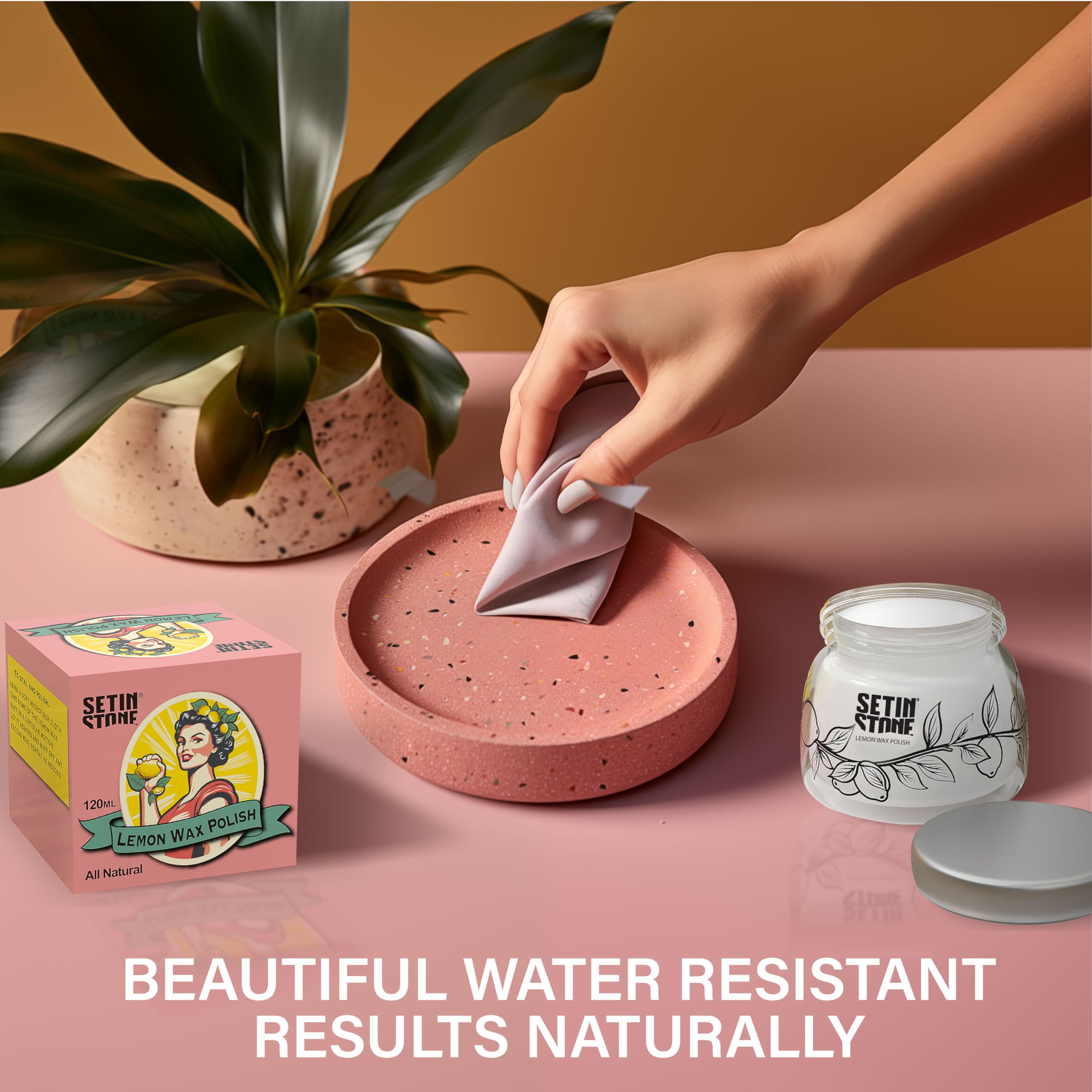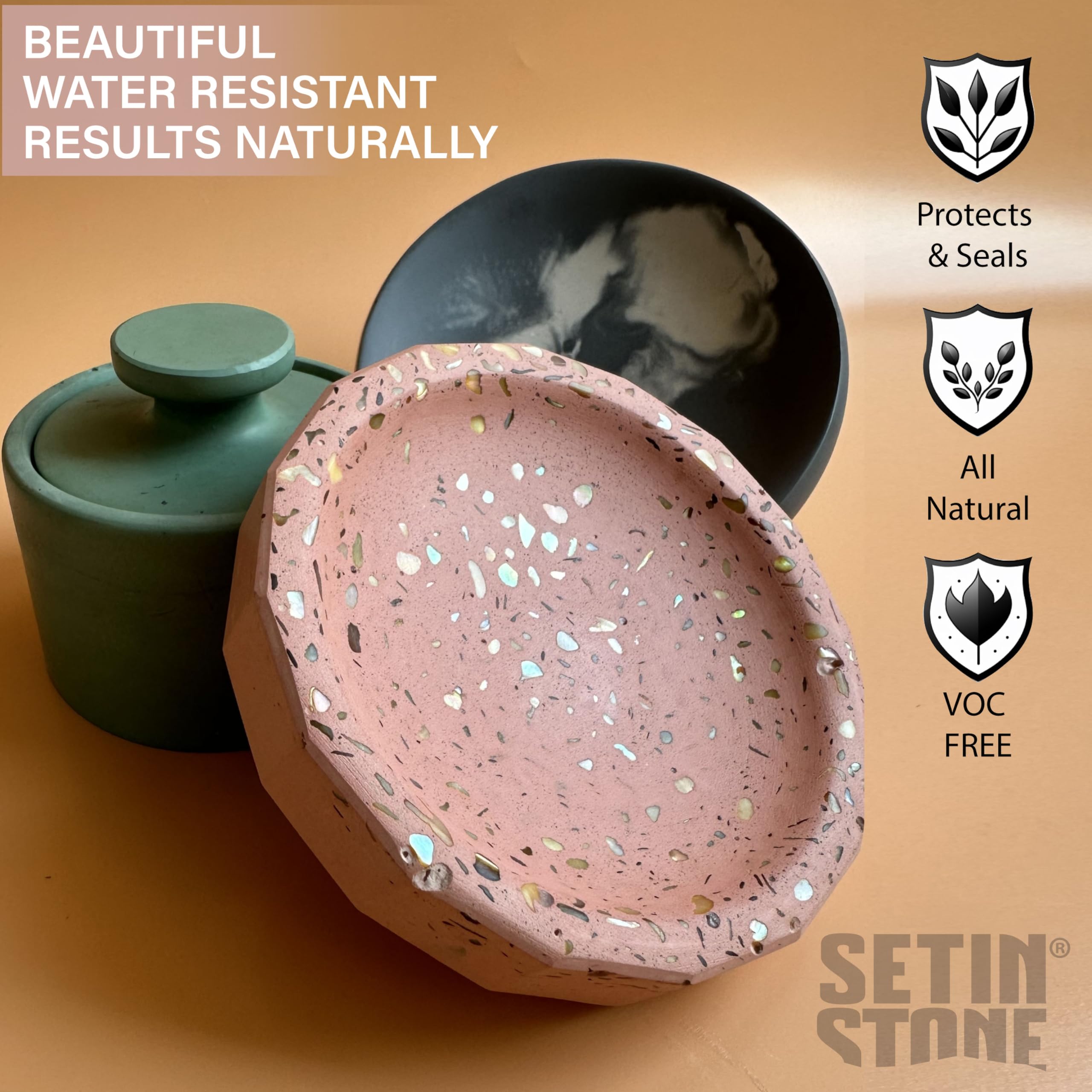 Enhanced Waterproofing: Experience unparalleled waterproofing with our premium wax Setinstone sealer. The specially crafted formula with Carnauba and Beeswax creates a natural barrier, protecting your eco plaster, gypsum and cement castings from moisture and environmental elements, be it concrete or granite stone countertops, cultured marble, furniture & tiles