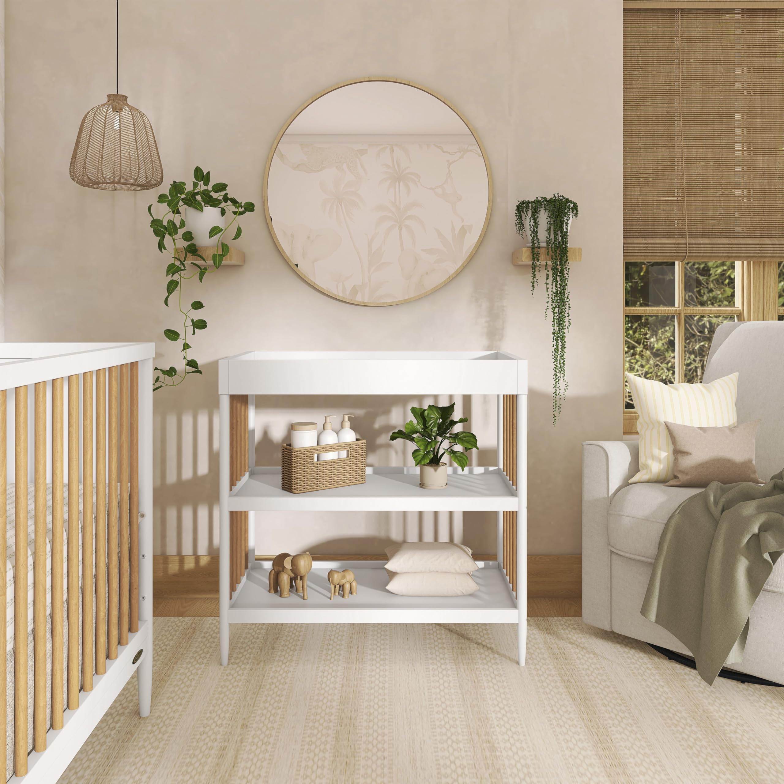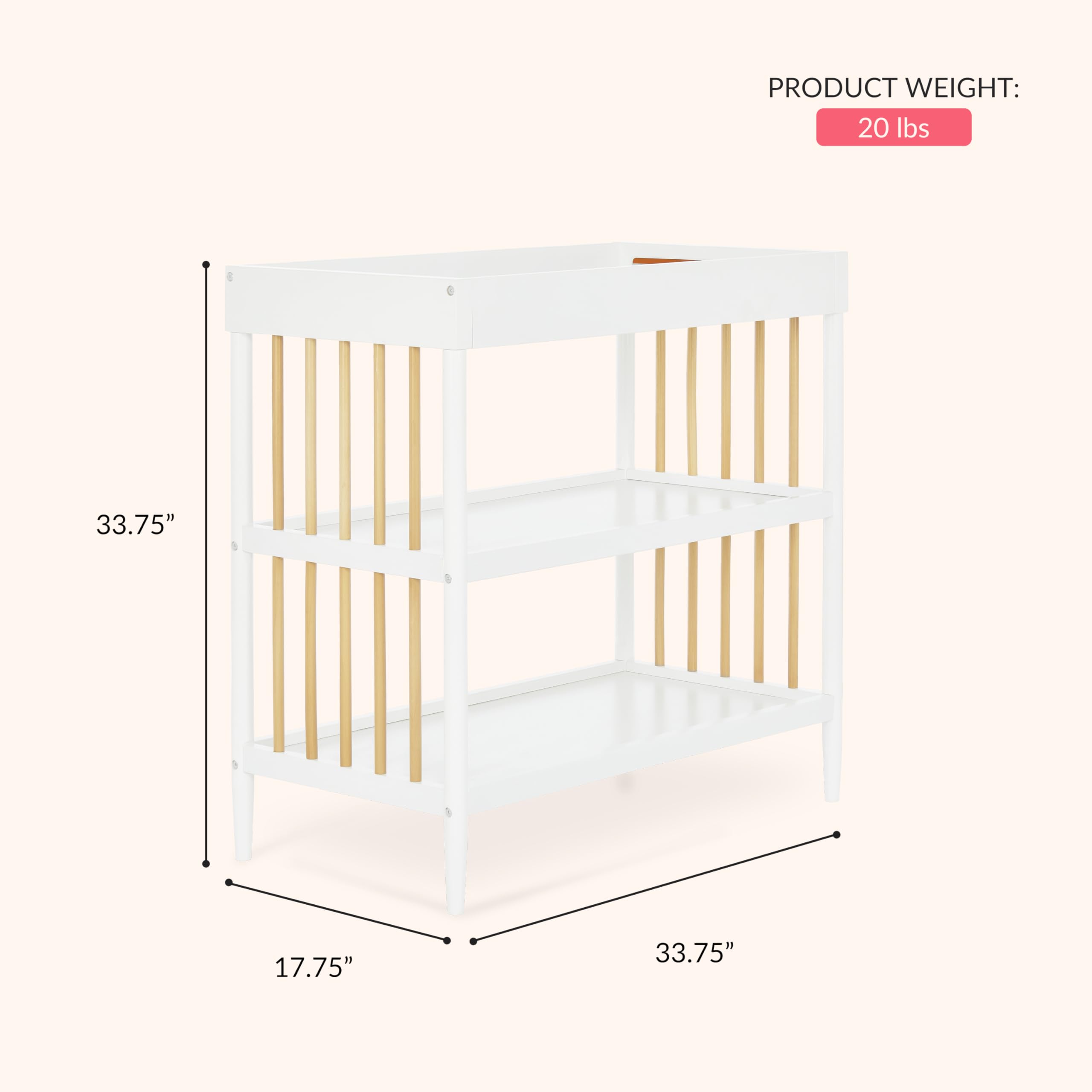 USEFUL STORAGE: Keeps your childβs essentials neatly organized and easily accessible in the two easy-to-reach, spacious shelves below the changing table. Product dimensions are 33.8L x 17.8W x 33.8H inches