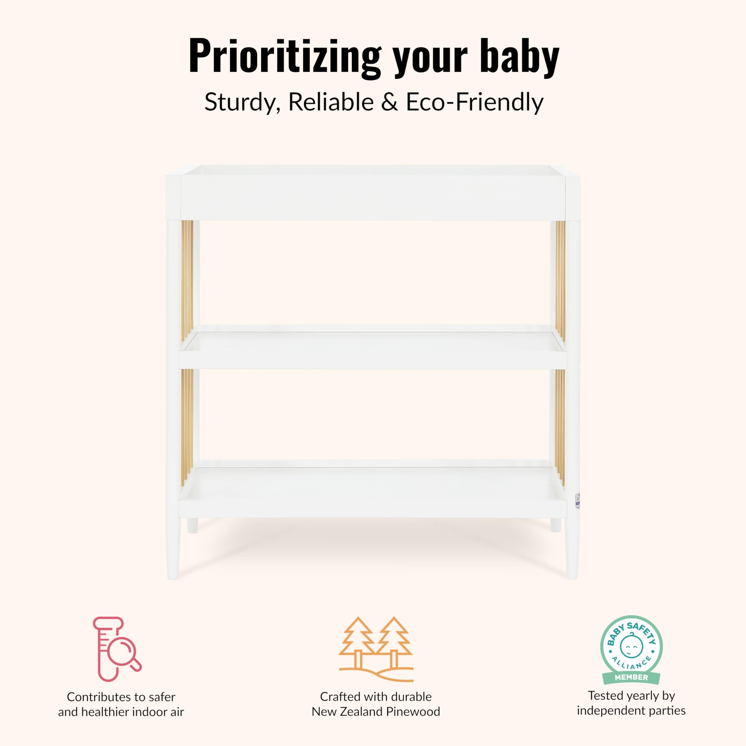 SECURE & FUNCTIONAL: Enjoy mess-free changing time thanks to the water resistant mattress pad. Safety rails on four sides make the changing table a fully enclosed & secure space; a safety strap keeps baby secure