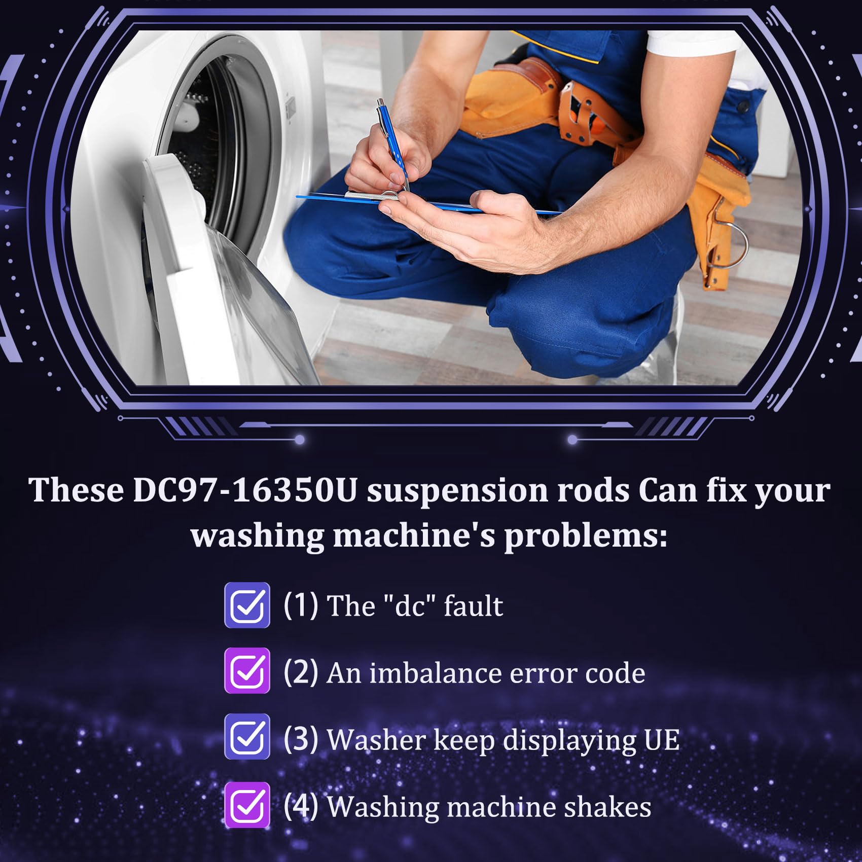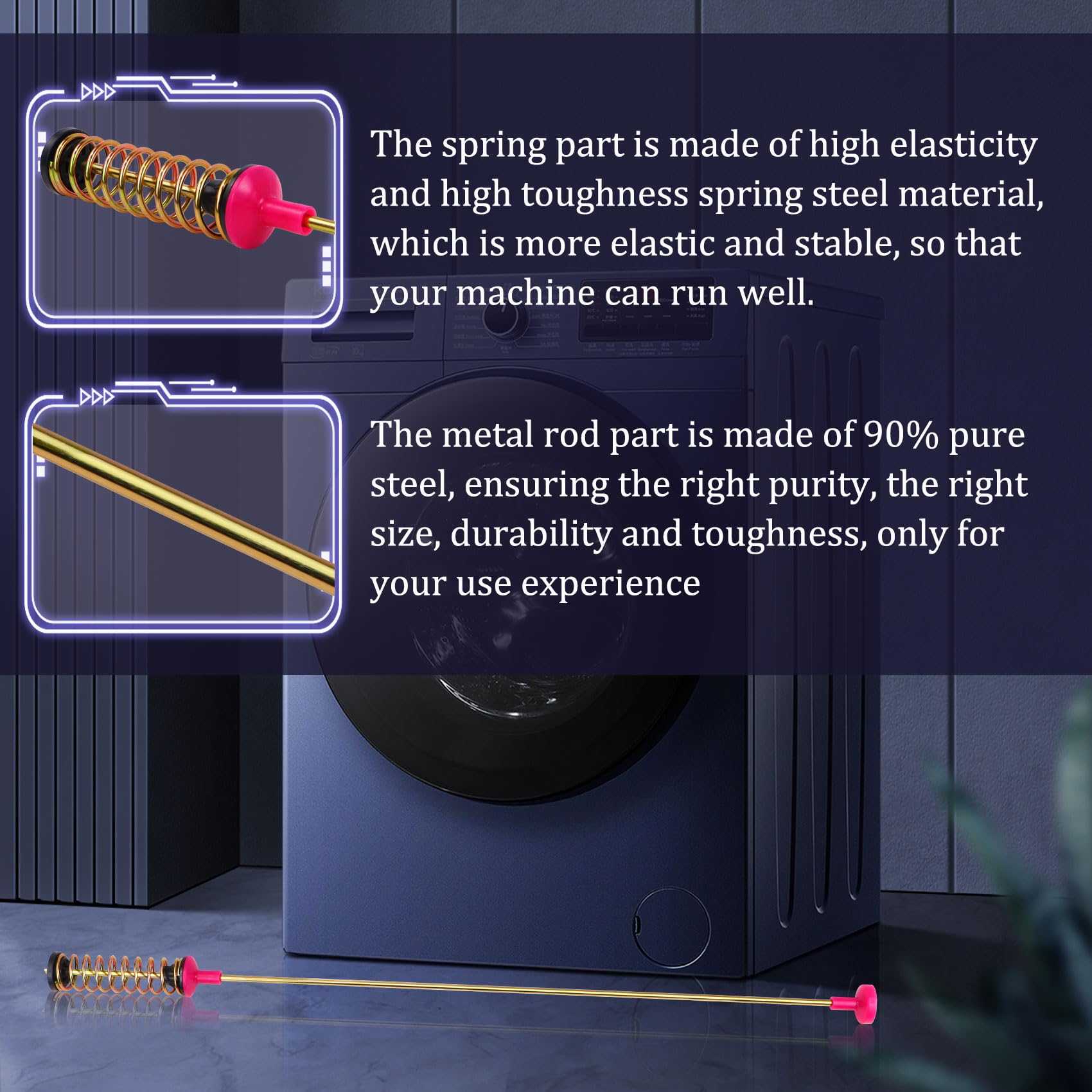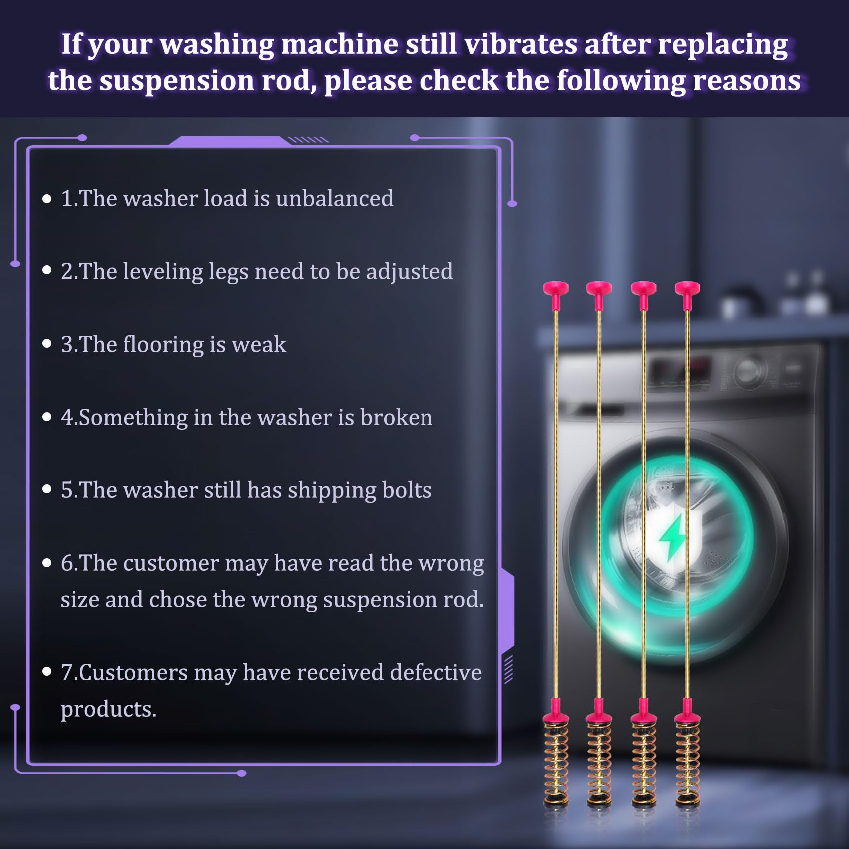 【Package includes】 This DC97-16350U DC97-16350S for Samsung Washer Suspension Rods includes 4 suspension rods. The length of the suspension rod is 26.4in. Please compare the length with your original suspension rod before purchasing. It can help to dampen the movement of the washer tub. If one or more of the suspension rods are broken, the washer will vibrate or shake. In addition, it can solve: ⑴The "dc" fault ⑵An imbalance error code ⑶Washer keep displaying UE