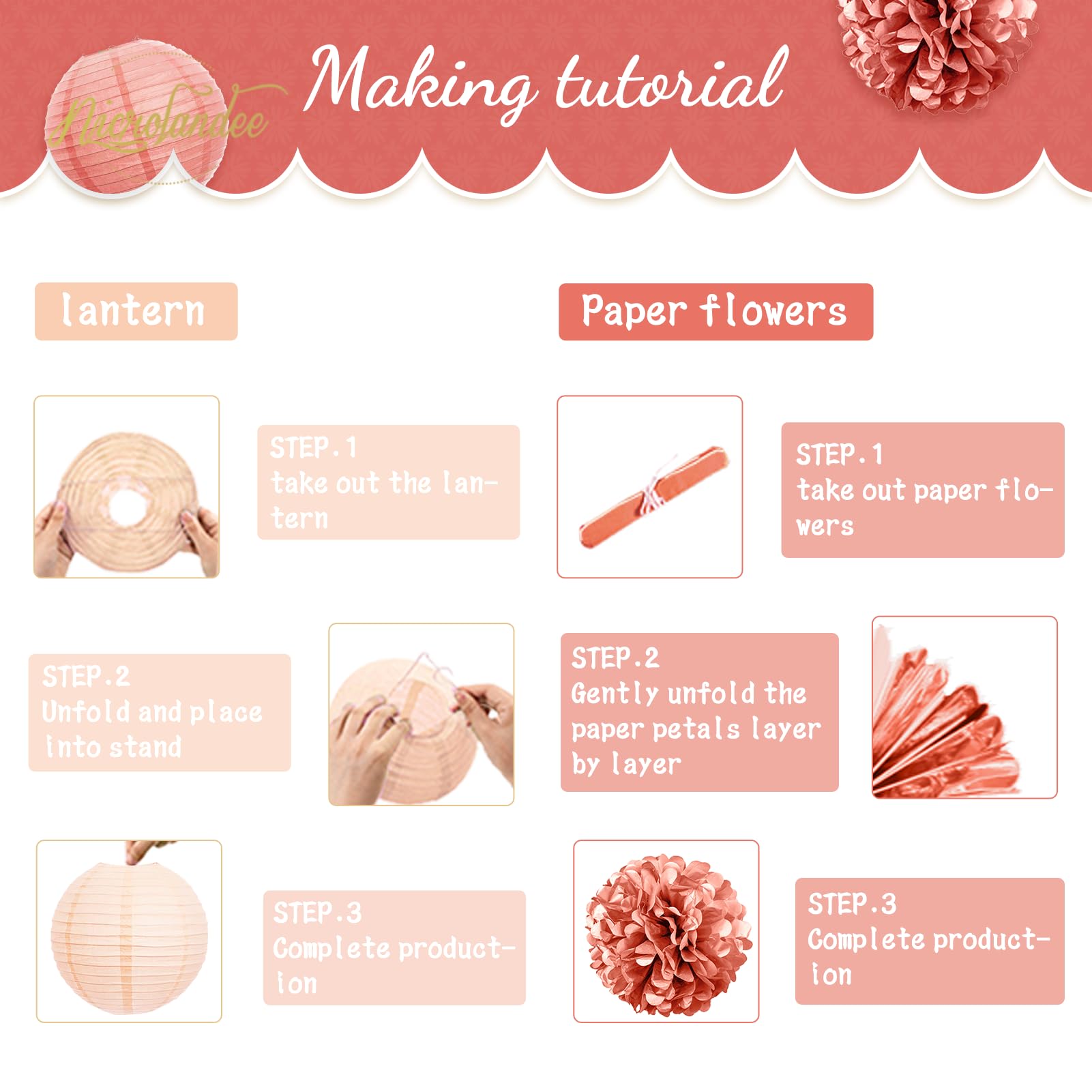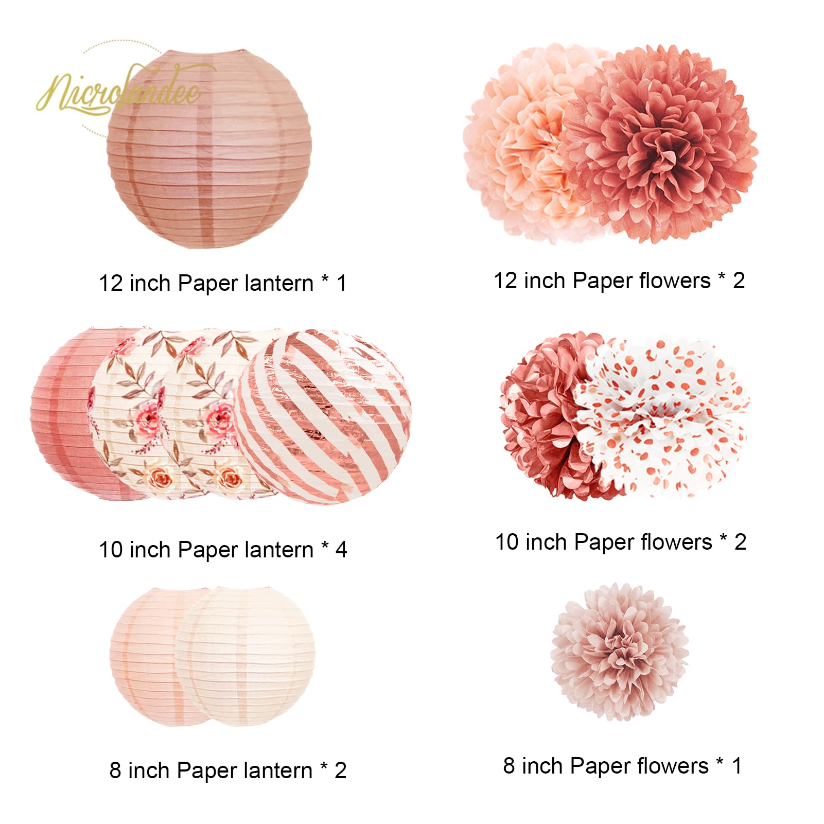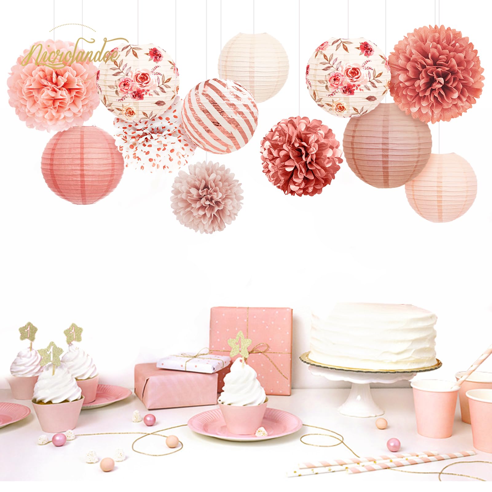Package Includes: 5 PCS tissue paper pom poms and 7 PCS paper lanterns. Elegant 12 PCS paper lanterns tissue pom poms party decorations kit for pink themed party