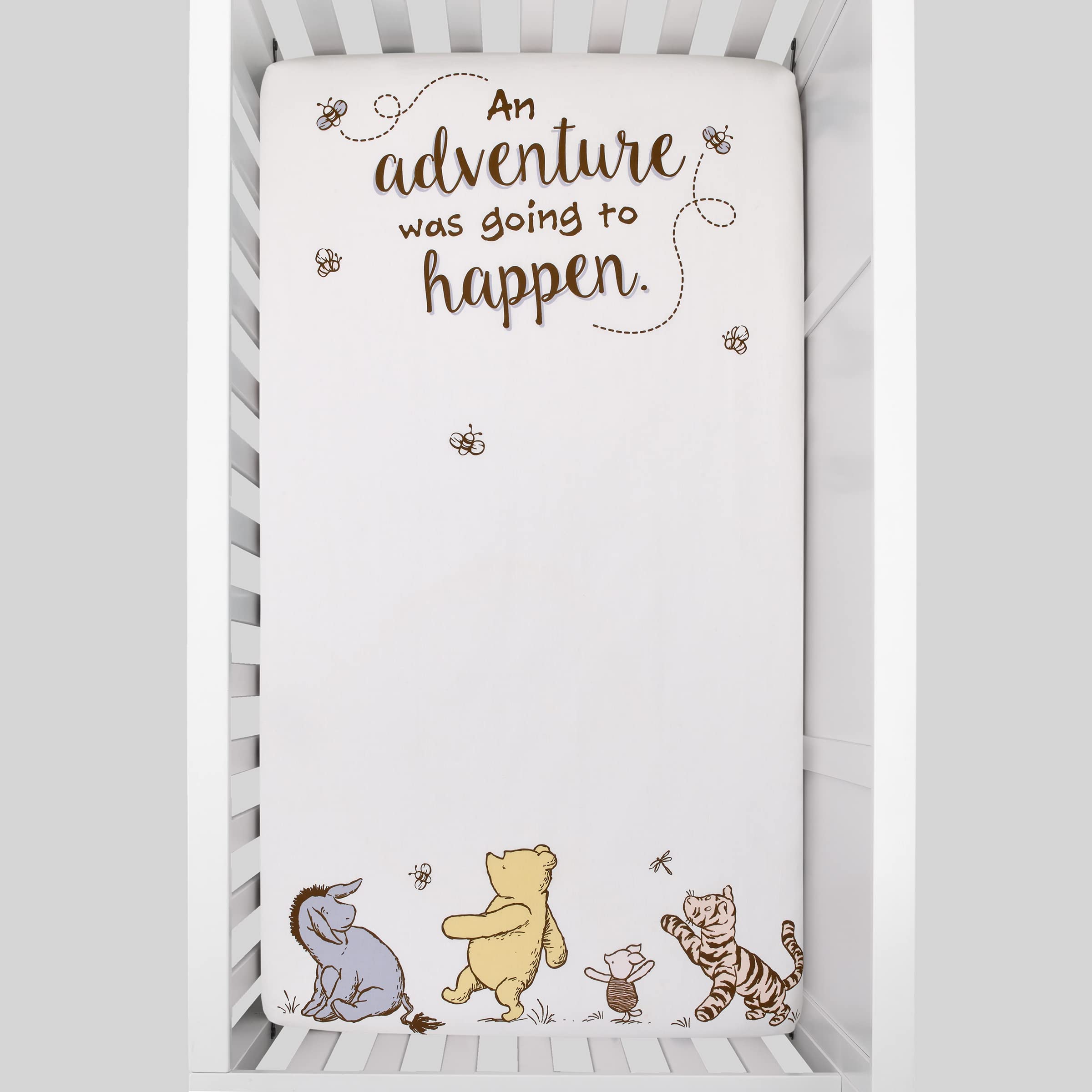Features a white ground with bees and all of the classic Winnie the Pooh characters!