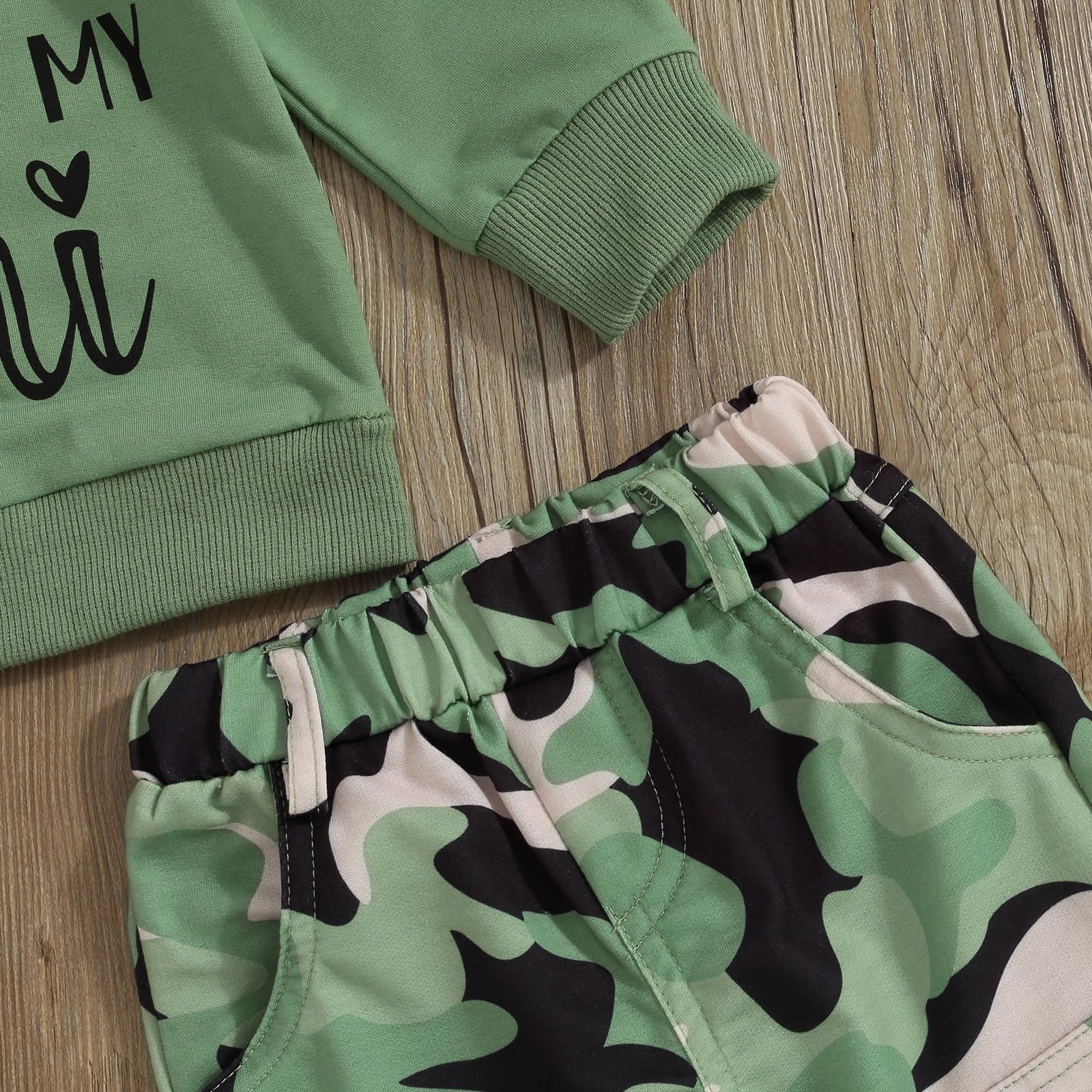 ♥Design: Baby girl fall outfits, pullover sweatshirt features letter print, long sleeves and a round neck. Trousers feature camouflage print and pockets.