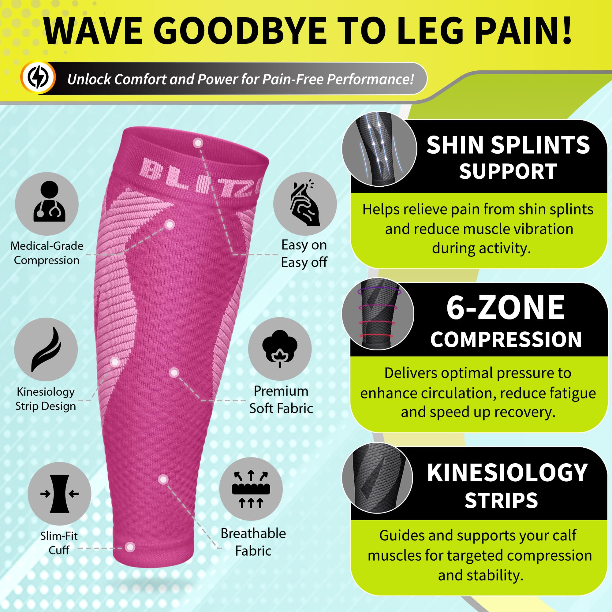 Patented Kinesiology Strips for Targeted Pain Relief: Developed and patented in New York, our calf compression sleeves incorporate advanced kinesiology strips that provide superior support, stability, and pain reduction. Designed using the renowned kinesiology technique, these strips promote natural pain relief and accelerate recovery by improving muscle function and reducing fatigue.
