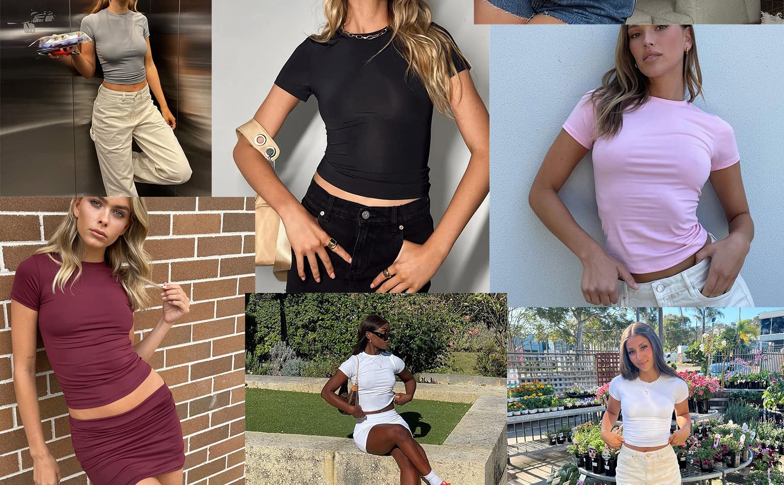 Casual Womens Short Sleeve Tops: This basic crop tops for women sexy casual, short sleeve, crewneck, basic womens going out tops in summer and fall, solid colors, include royal blue, pink, white and black, cute and trendy, fits wear in different occasion