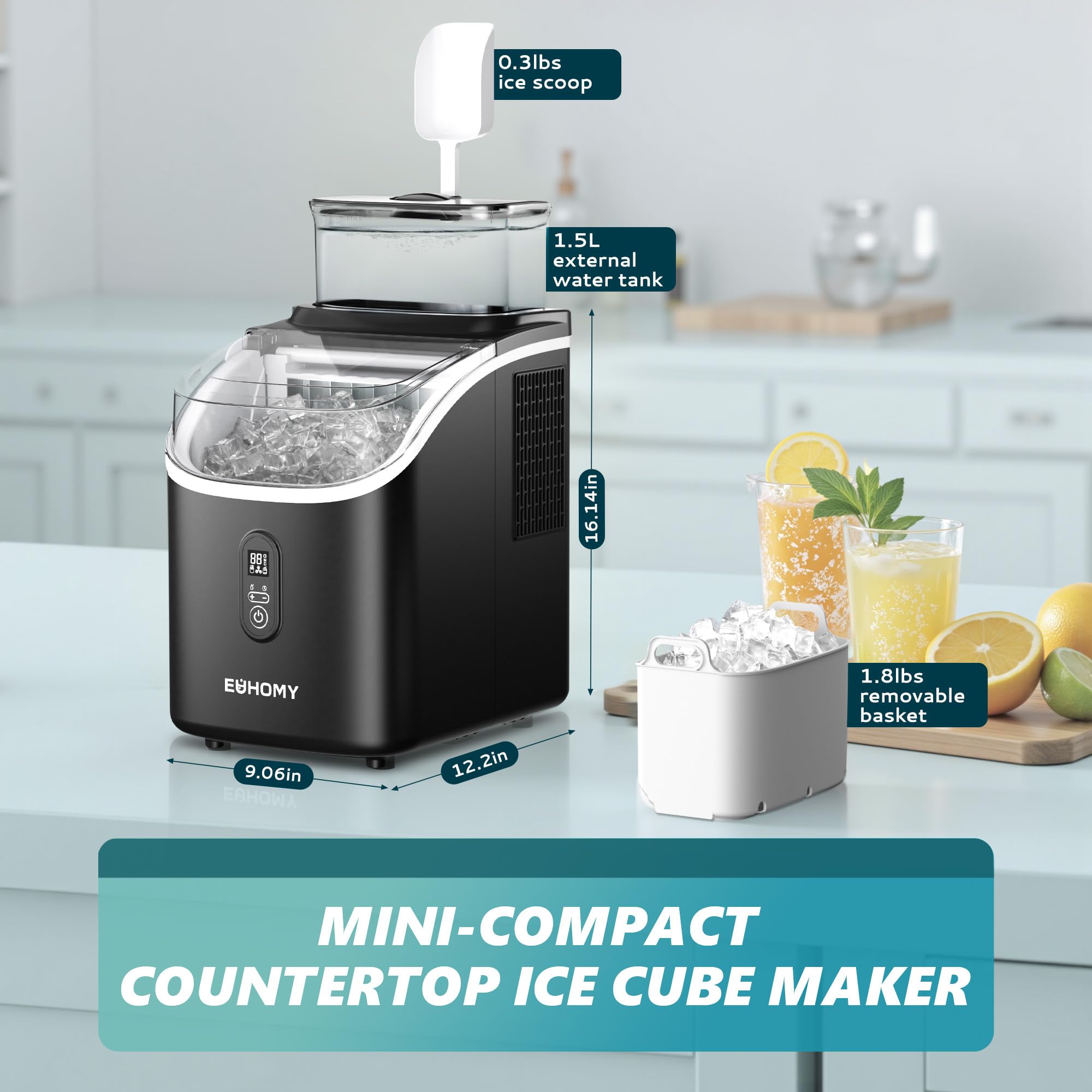 13 Mins Ice-Making & Ultra Quieter: Our EUHOMY countertop ice maker only takes 13mins that will enjoy 16 crystal fresh CUBES ice. With a 1.5L external water tank and powerful compressor, the portable ice cube maker machine easily makes maximum ice capacity to 34lbs ice per day and holds up to 1.8lbs ice at a time. Also, our ice maker is not only excellent in refrigeration, but also at less than 42db normal noise, ensuring a comfortable and quiet environment to enjoy ice-making, similar to ae working freezer