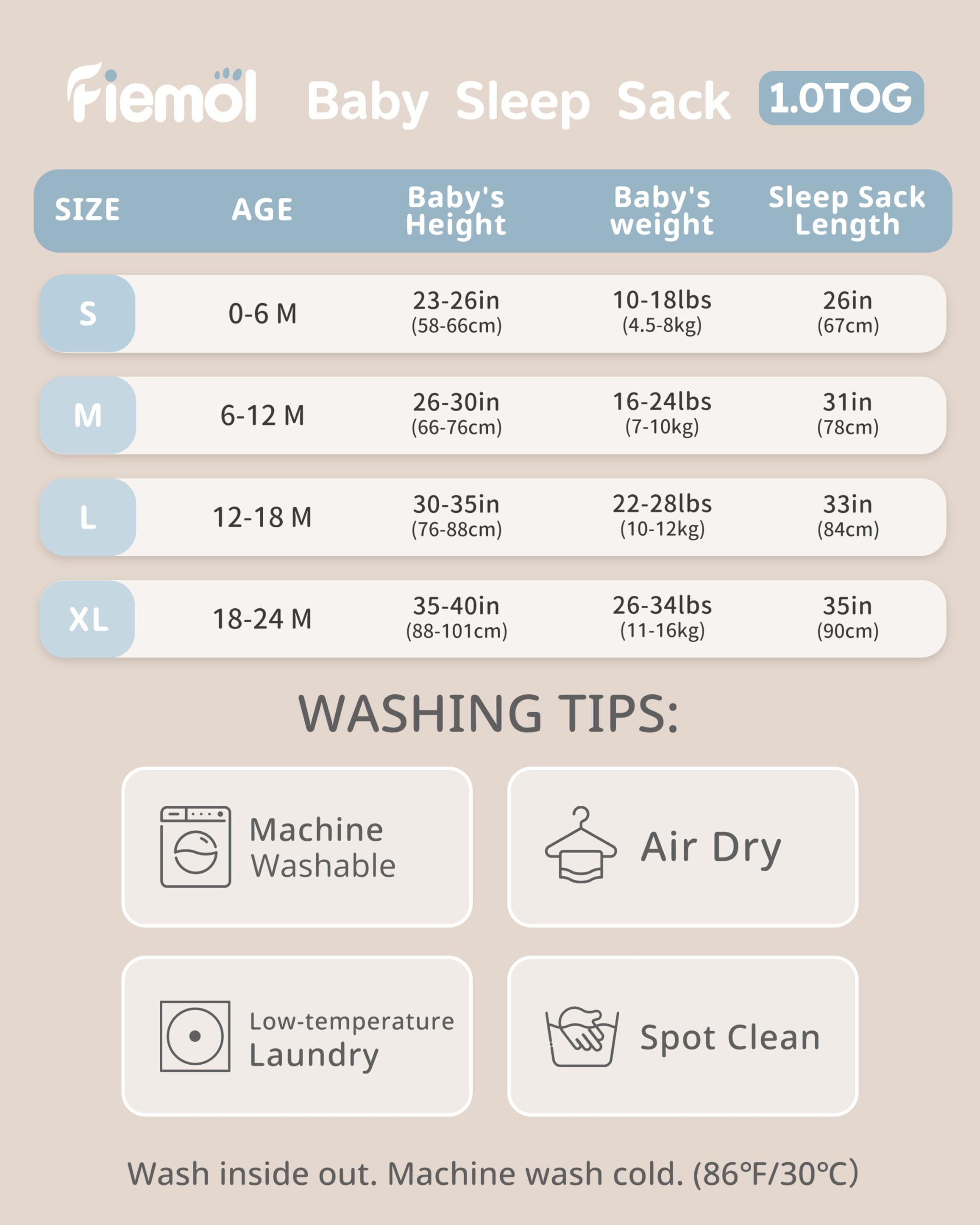 Sizes for Baby's Growth: From newborn to toddler, we offer four sizes to accompany every stage for your little one: 0–3 months and 3–6 months (10-18 pounds), 6-12 months (16-24 pounds), 12-18 months (22-28 pounds), 18-24 months (26-34 pounds). The relaxed fit allows freedom of movement for active little ones. If you're between sizes, please choose the smaller one or see the size chart for a better fit. And machine wash gently in cold water (30°C / 86°F) to maintain softness.