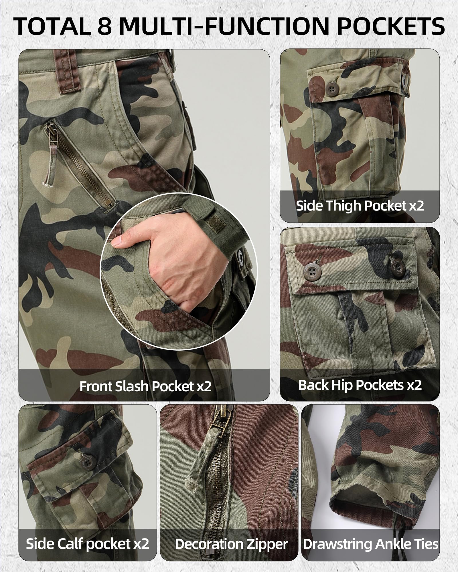 Product Material: Solid and camo cargo pants for men use 100% cotton fabric, treated for ease of care with a wrinkle-resistant finish and durability,it features non-slip, durable, comfortable, abrasion-resistant soft,breathable and sweat-absorbent,can repel the stains, liquids and soil keep you all day dry and clean.Relaxed fit military pants with zipper closure and straight leg,drawstring tie inside the ankle and the waist for comfort fit.