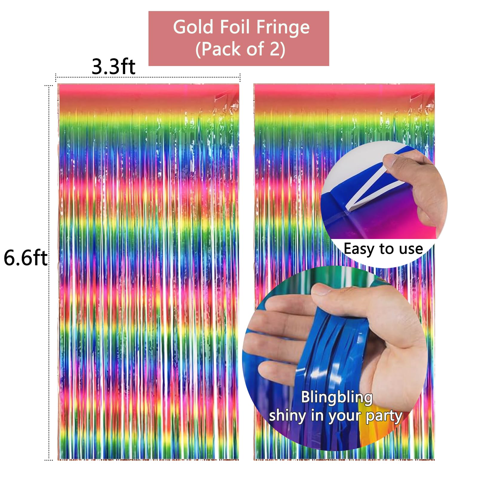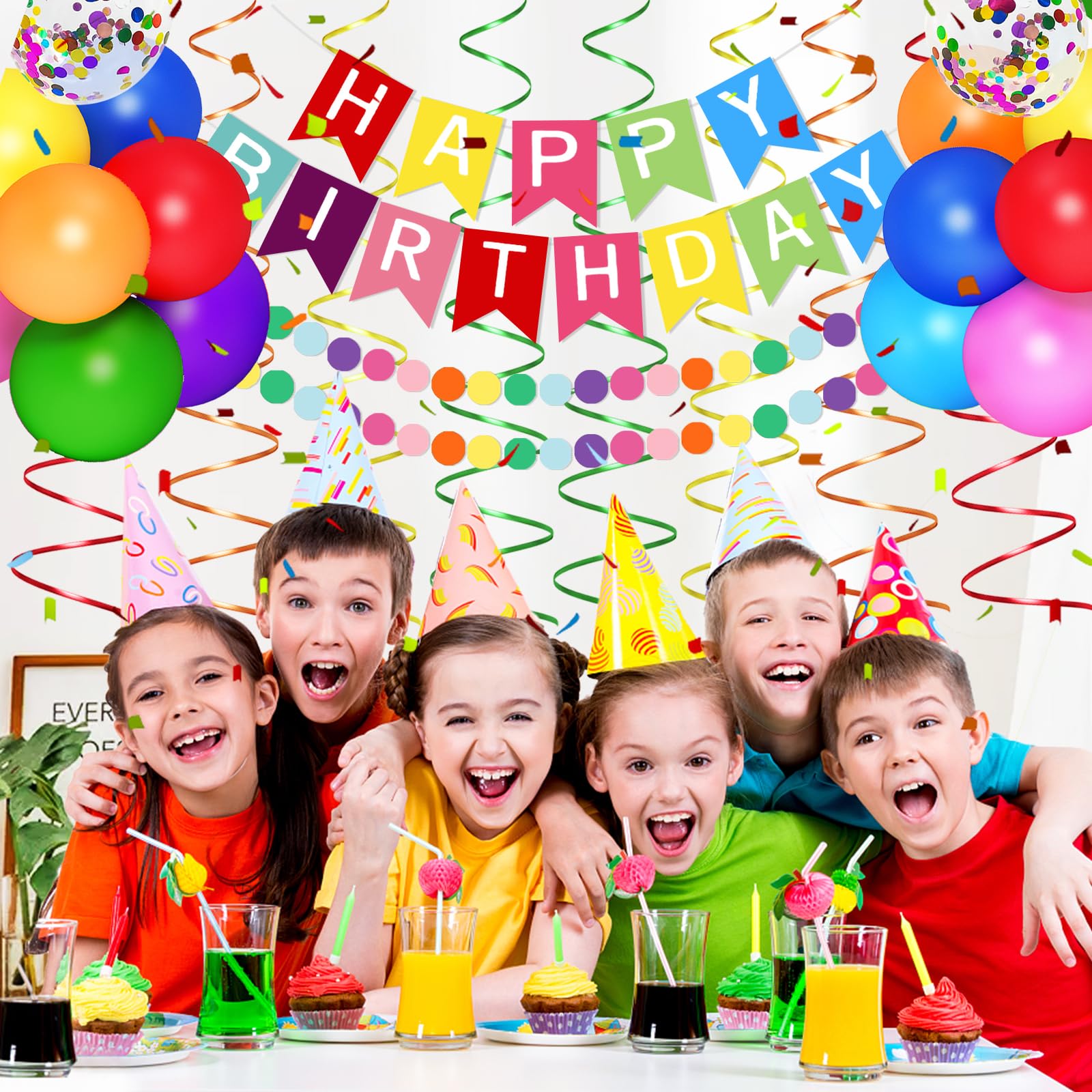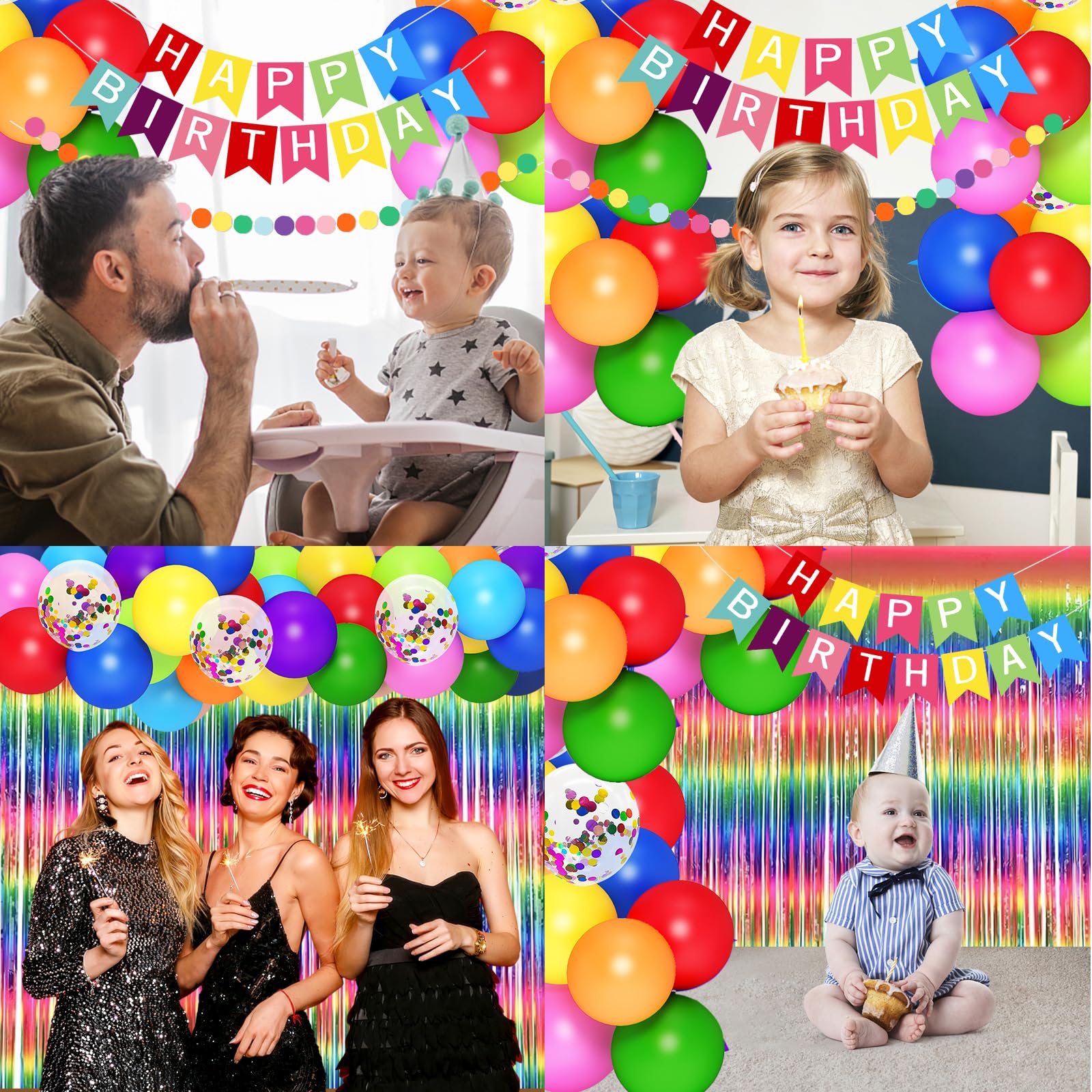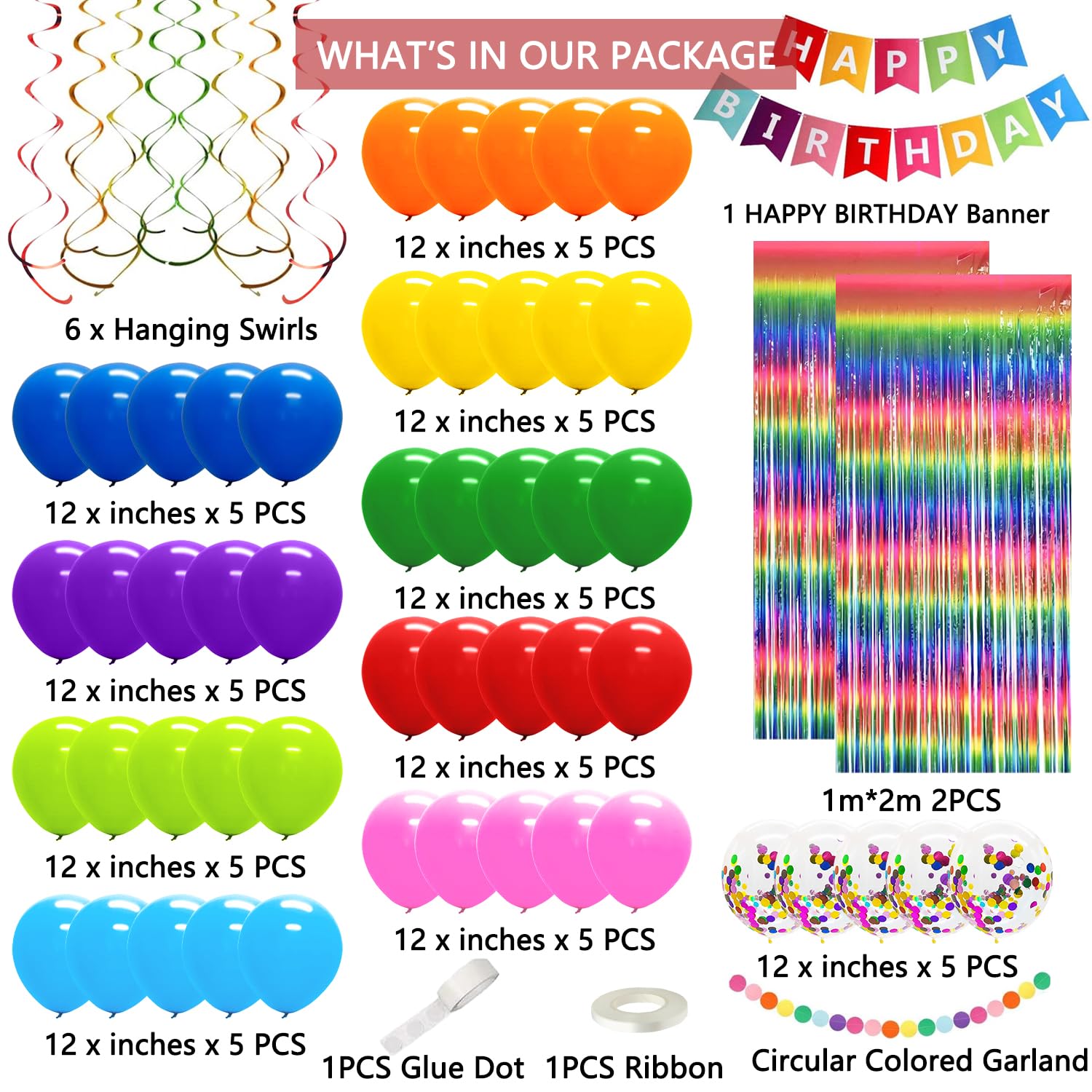 【RAINBOW THEMED】- Our rainbow party decorations include: happy birthday banner, 2pcs fringe party curtains, 45pcs colorful balloons,5pcs confetti balloons,8pcs colorful hanging swirls,1pcs colorful circle parper garland,1pcs ribbon/ dot glue. Make your party more colorful and leave more good party memories