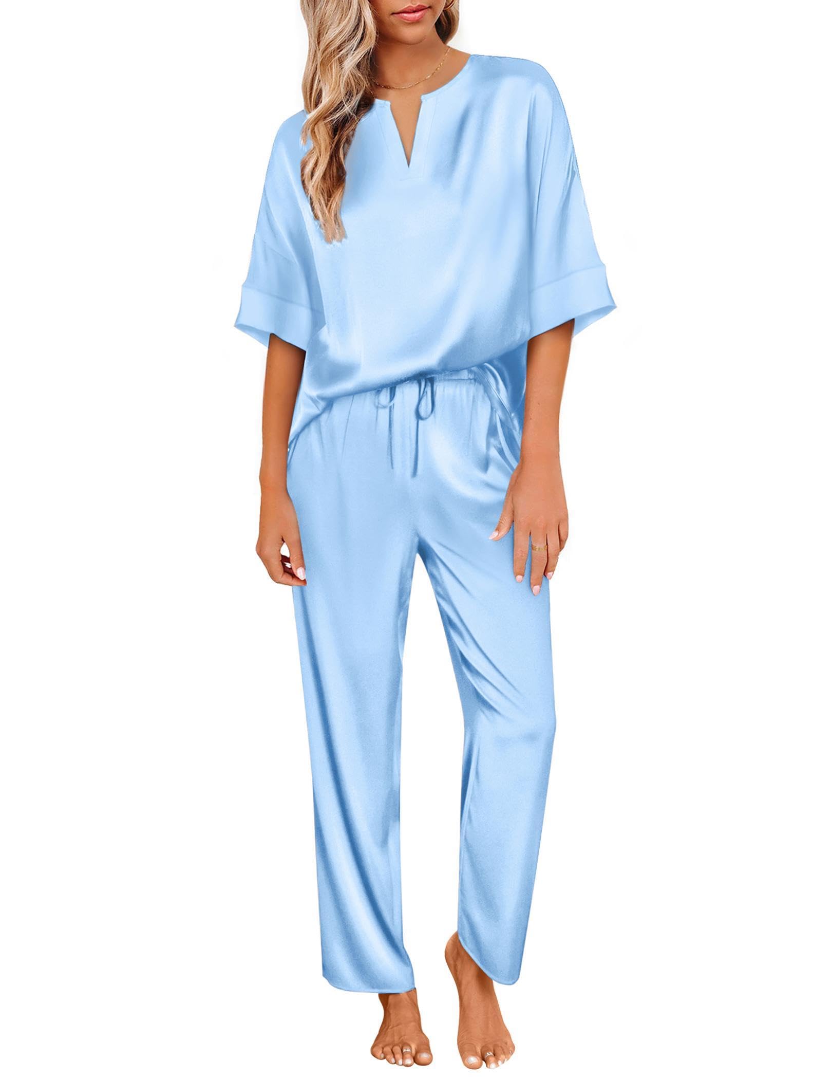 A lightweight two-piece pajama set featuring a pullover tee top and long pants. Soft satin silky fabric, comfy to wear.