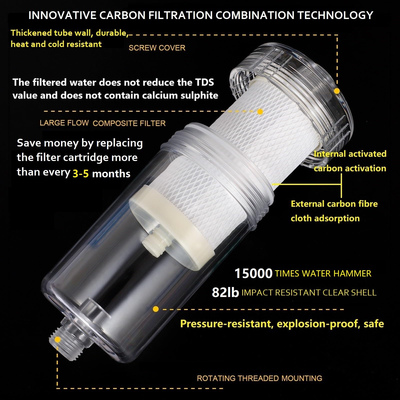 ADVANTAGES COMPARISON:a. 𝟎.𝟓 -1 μ𝐦 filtration. b. 6.7'' Capacity. c. Innovative filter combination technology. d. High flow rate of 10 GPM, internal activated carbon activation, external carbon fiber and pp cotton adsorption. e. Moisturize skin. f. With waterproof ring, will not leak. g. Transparent tube wall made of 82 lb. impact and pressure resistant material, easy to recognize water filtration. h. After 3-5 months to replace cartridge, save money. i. Equipped with brass inlet connector to avoid inlet pressure loss and sealing