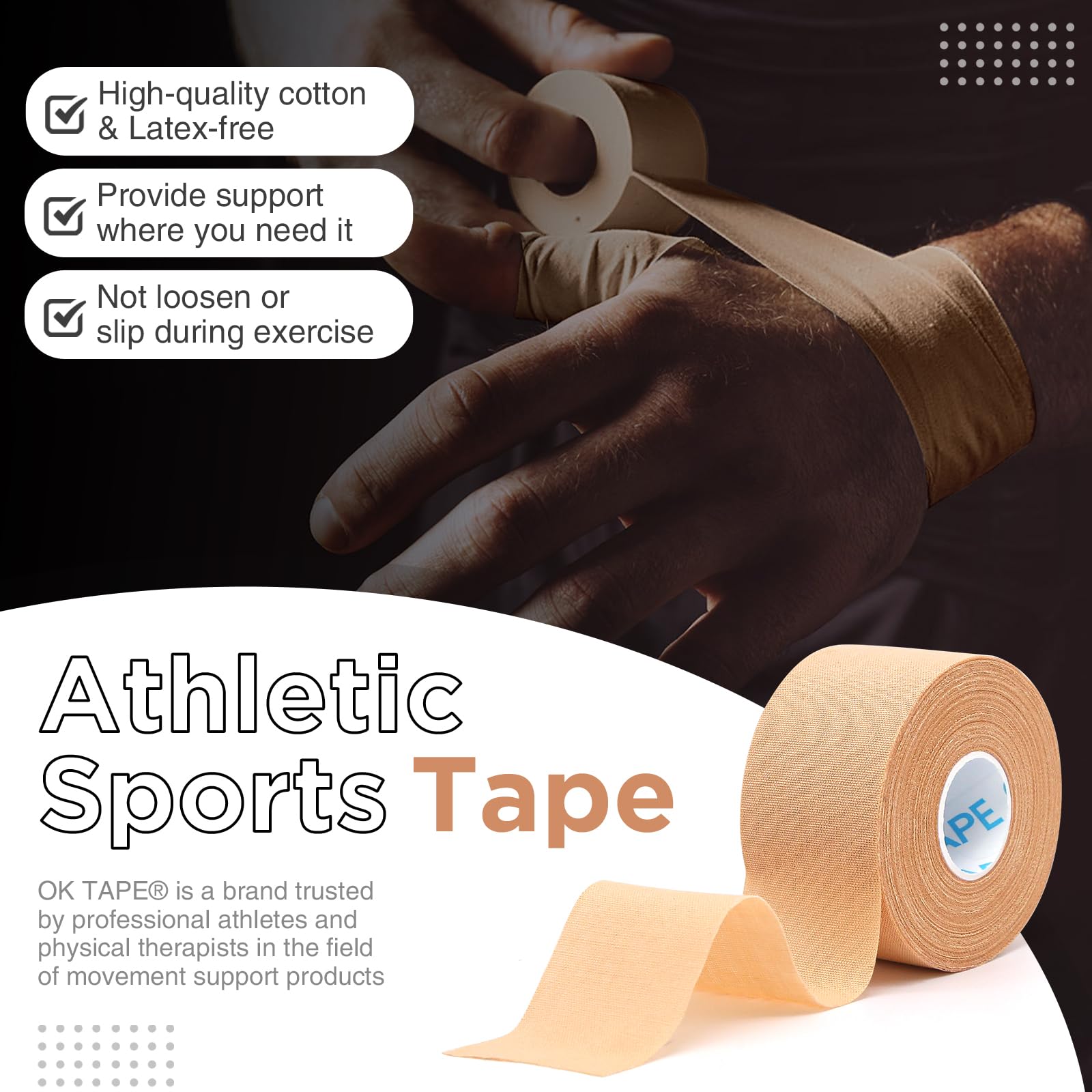 EASY TO TEAR: No scissors needed! You can easily unwind and tear OK TAPE athletic tape by hand for quick and effective taping