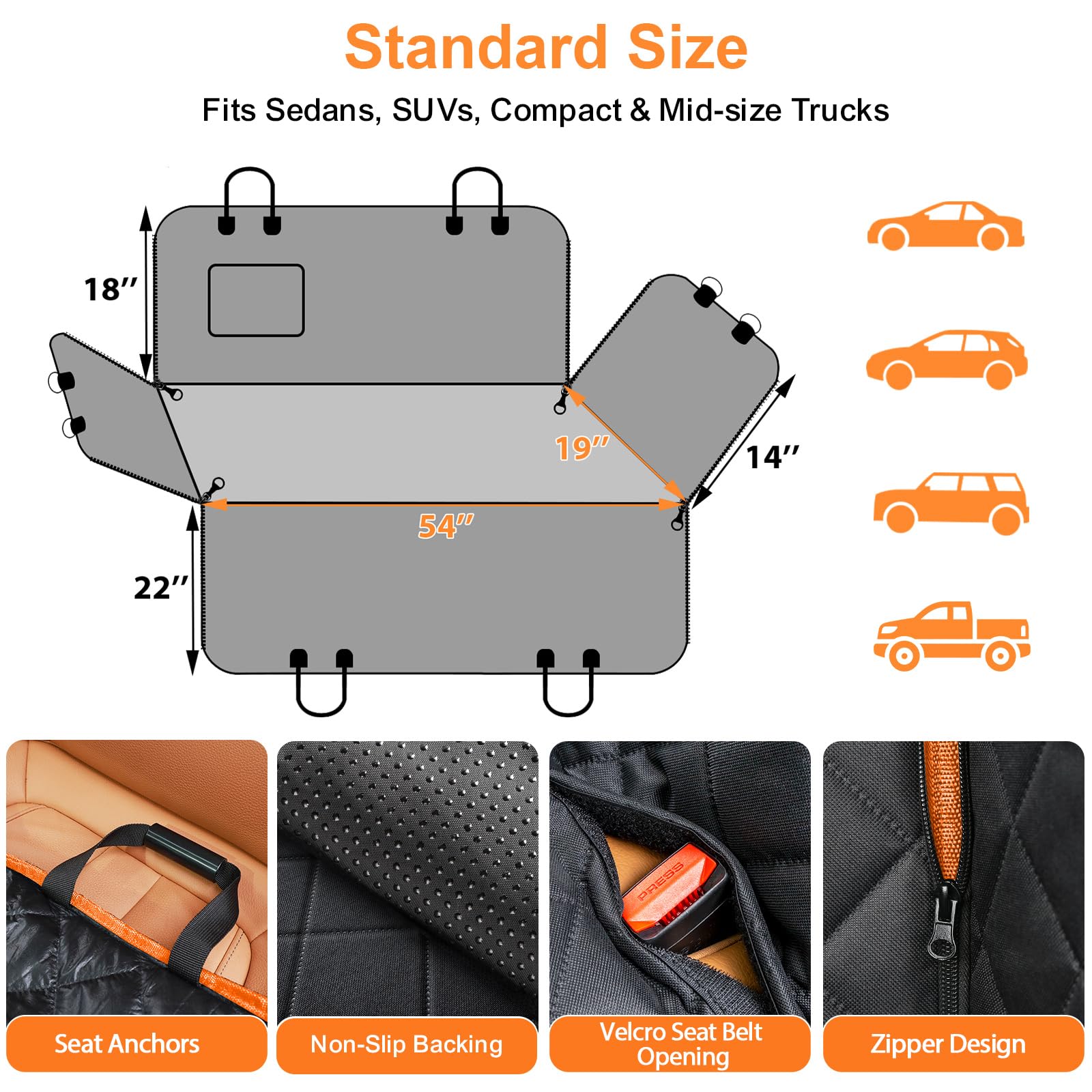 Fits Sedans, SUVs, Compact &Mid-size Trucks: Before ordering, please confirm whether your backseat length is close to 54 inch. The Standard size fits Sedans, SUVs, and Compact & Mid-size Trucks. It can cover the entire back seat for ultimate protection and hassle-free rides. Now you can enjoy family excursions without damaging your car!