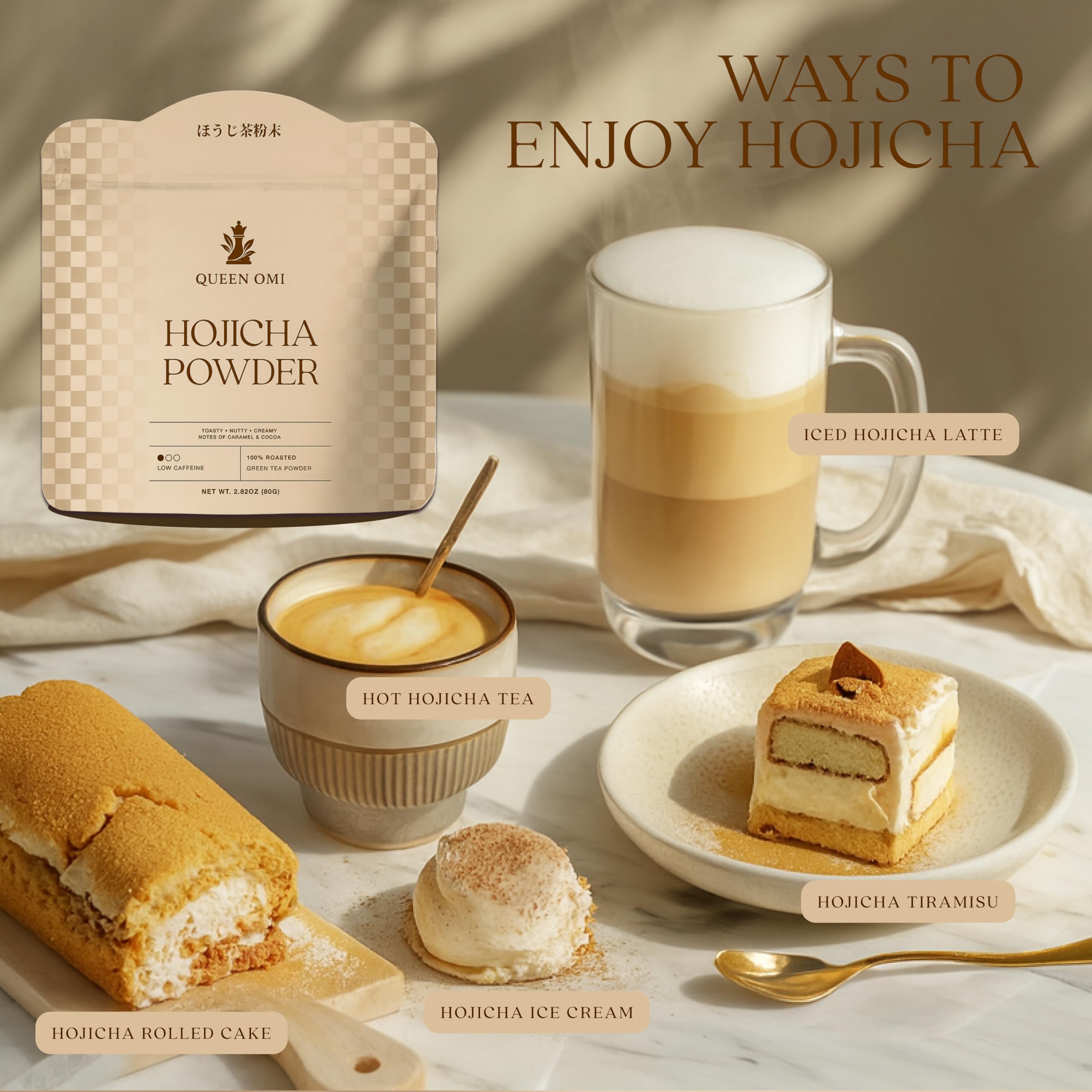 Grown in Japan and crafted from mature green tea leaves, Queen Omi Organic Hojicha Powder is meticulously slow roasted to unveil a warm, toasty flavor with a signature reddish-brown hue. With its smooth, nutty complexity and naturally low caffeine content, it’s a refined alternative to matcha and coffee—ideal for mindful mornings and intentional evenings. Rich in antioxidants and gentle on the stomach, our ultra-fine powder dissolves seamlessly into water or milk for silky lattes, creamy smoothies, and elegant baked creations. Its heat-stable, deep-roasted aroma remains intact even at high temperatures, making it a versatile staple from the kitchen to the office. Encased in an 80 g pouch, Queen Omi isn’t just tea—it’s a daily ritual, elevated.