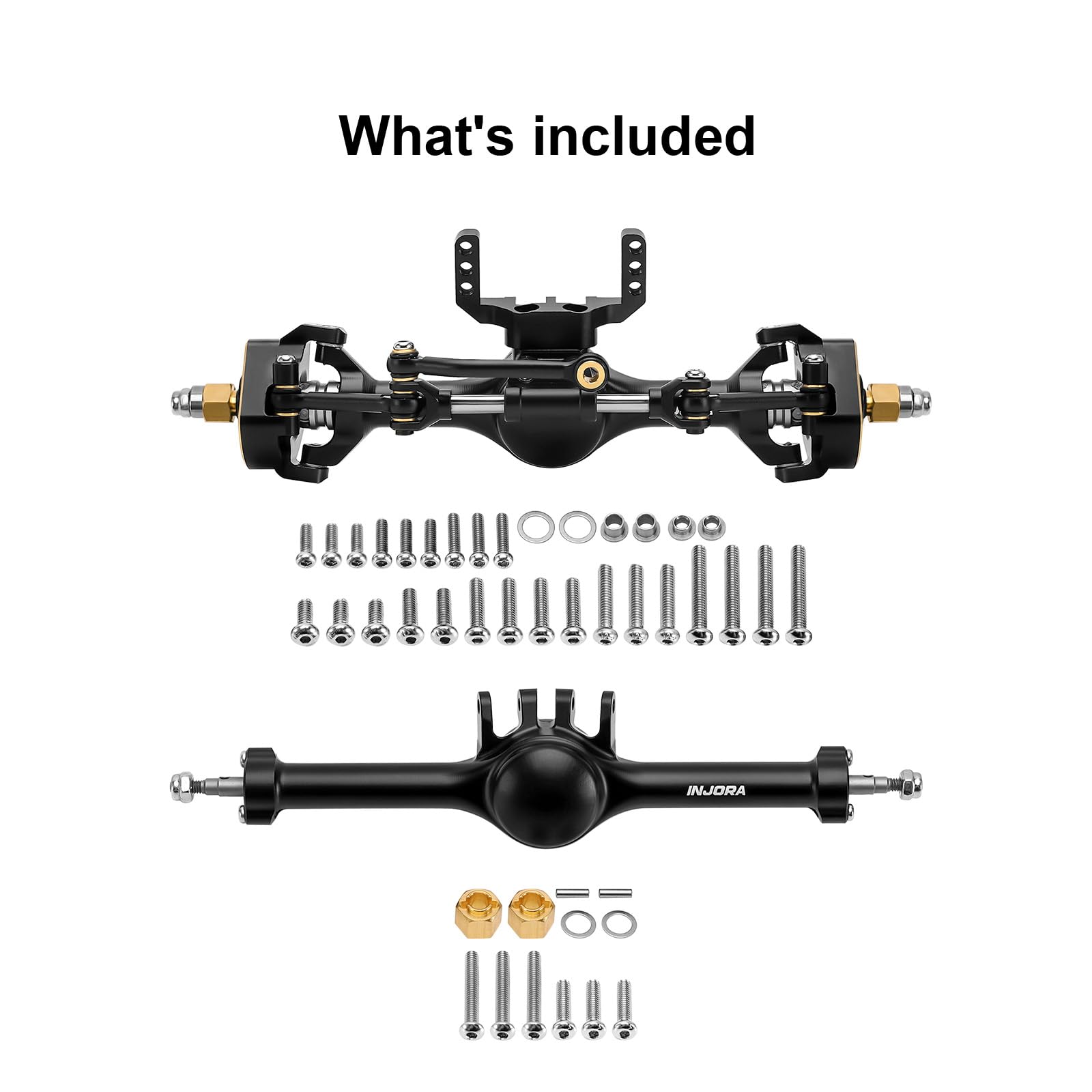 Note: Not compatible with the TRX4M stock chassis. Steering knuckles and double joint shafts are not compatible with the TRX4M stock axle housing. Compatible with INJORA INJS2065, INJS11, and TRX4M stock servos.
