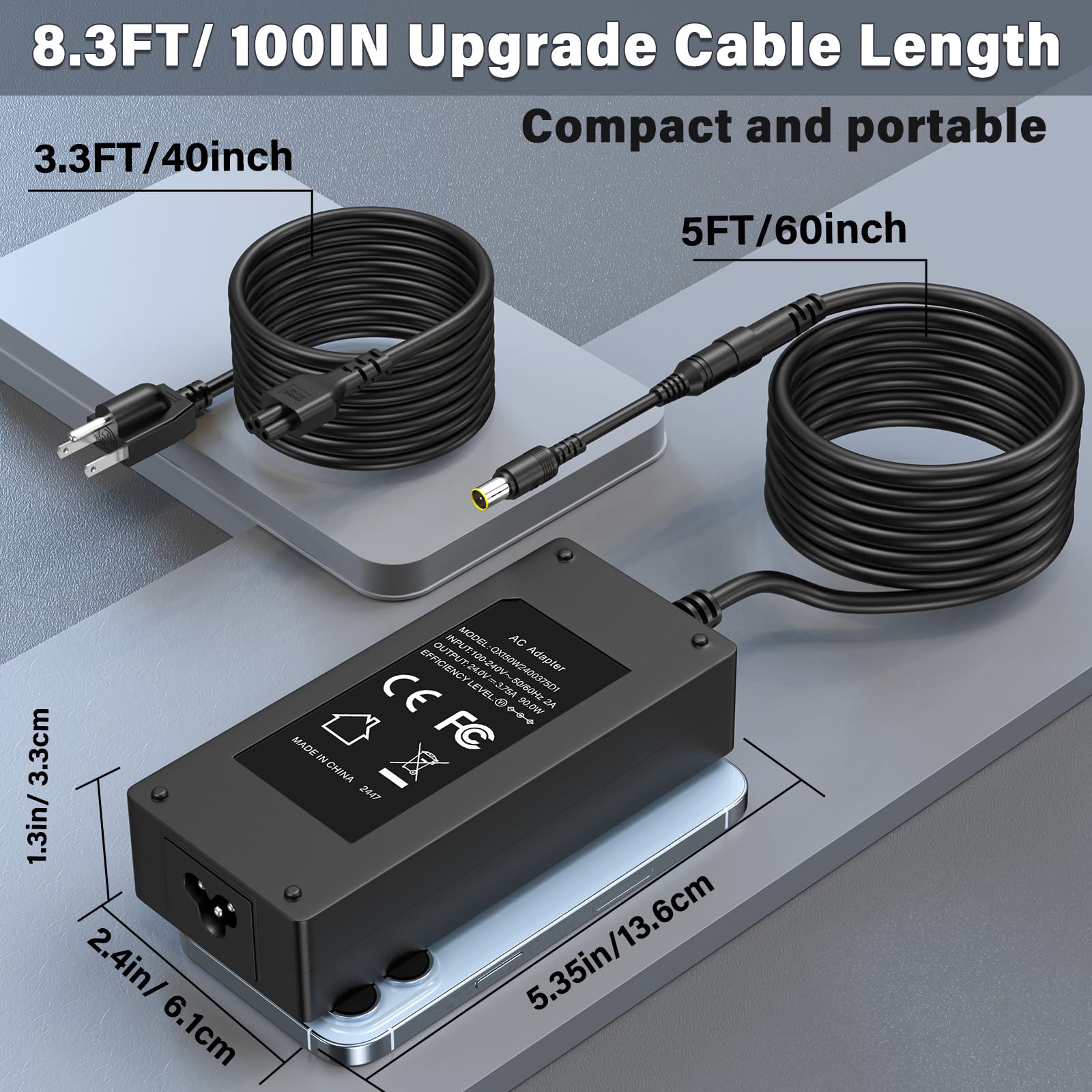 Specifications: The AC/ DC power adapter for Jackery power station is designed in global input voltage range: 100-240 Volt 50/ 60HZ; output: 24V 3.75A 90W( Compatible with 20V 3.25A 65W); total cable length: 8.3 FT/ 100 inch, with class 2 power supply US standard wall plug