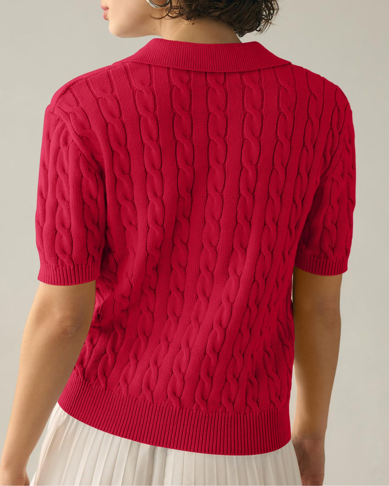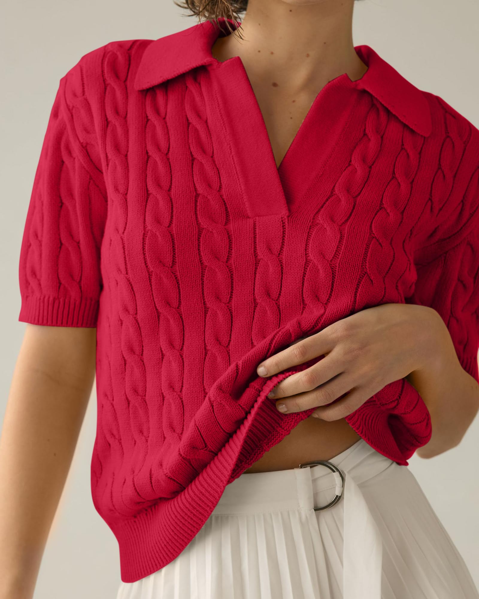 Features: Women's Cable Shirt, Short Sleeves, Slim V Neck, Small Lapels, Elasticized Ribbed Cuffs and Hem, Knit, Basic Solid Color, Loose Fit, Casual Style. Comfortable women's soft summer top.