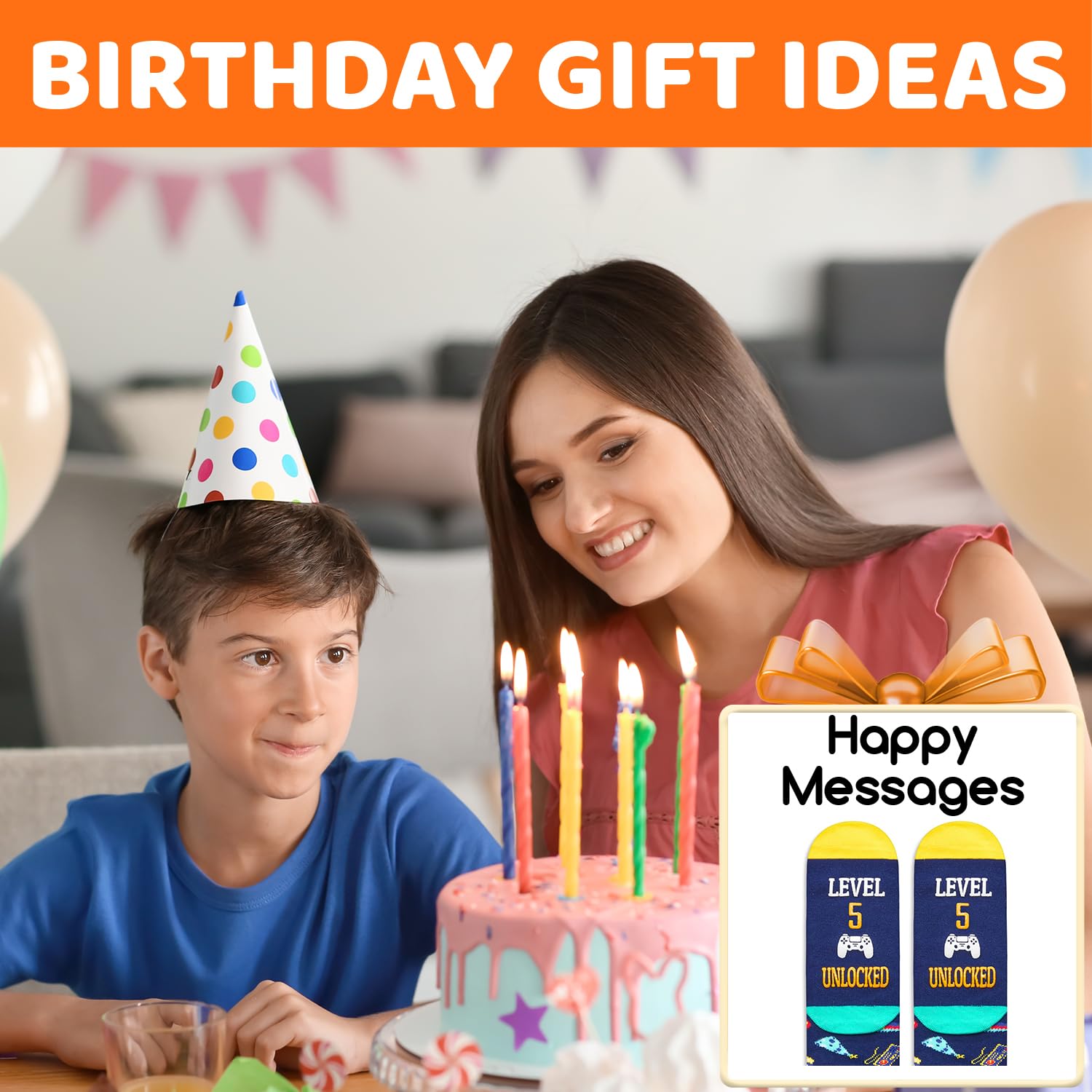 GIFTS FOR CHILDREN: These festive socks feature birthday gifts, balloons and game machines on top, with a fun secret message on the bottom: "LEVEL 5 UNLOCKED." Perfect for holiday gifts like Birthdays, Christmas or White Elephant exchanges.