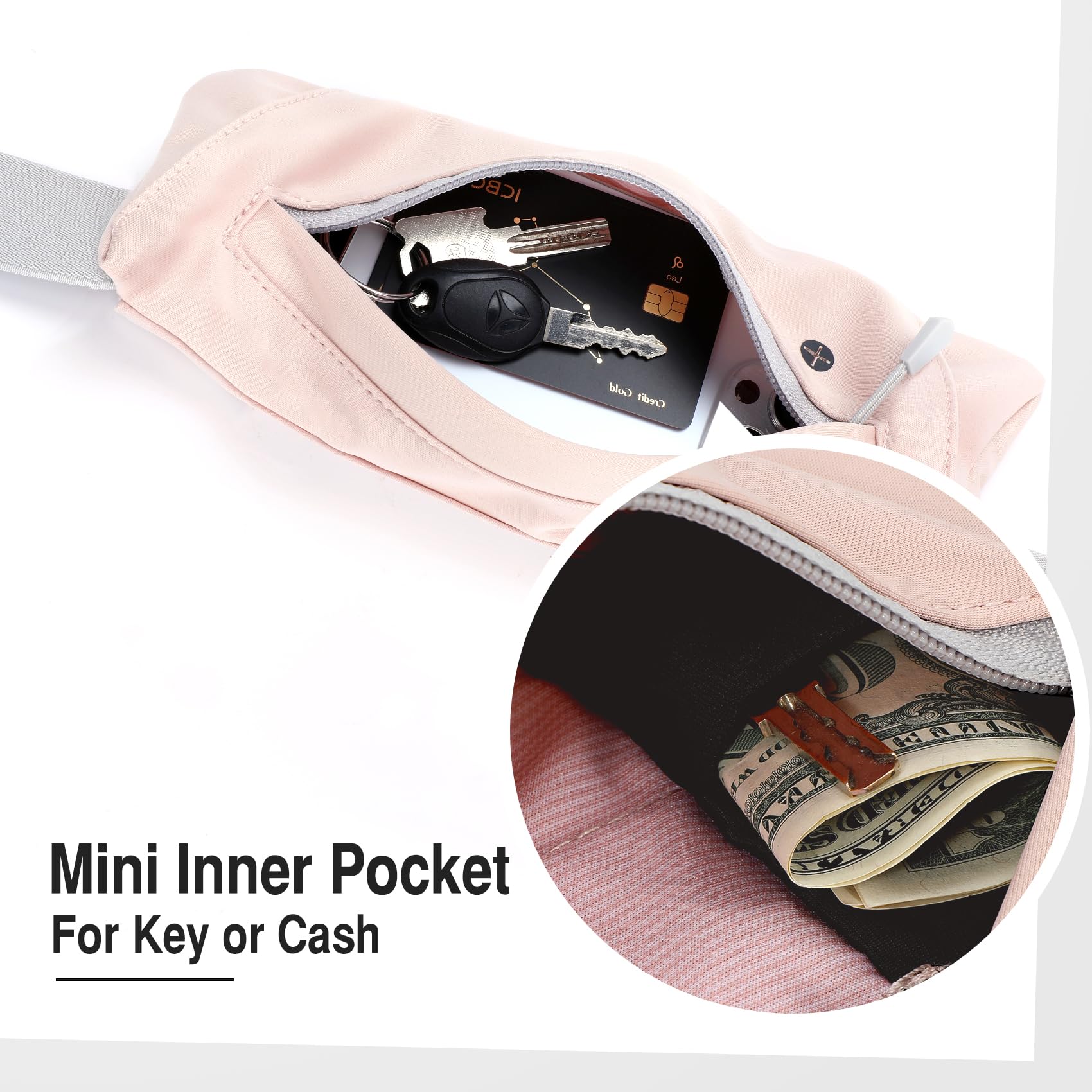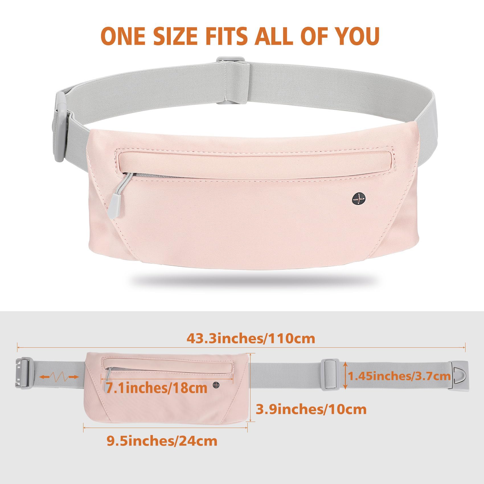 Adjustable Waist Strap -Stretchy running fanny pack fits for waist size from 24" to 48". Secure zippered pockets size: 9.5"(L)*3.9"(W), easily hold all kinds of cell phones with valuable items, such as keys, cards, cash, earphone, etc. Suitable for most women and men.