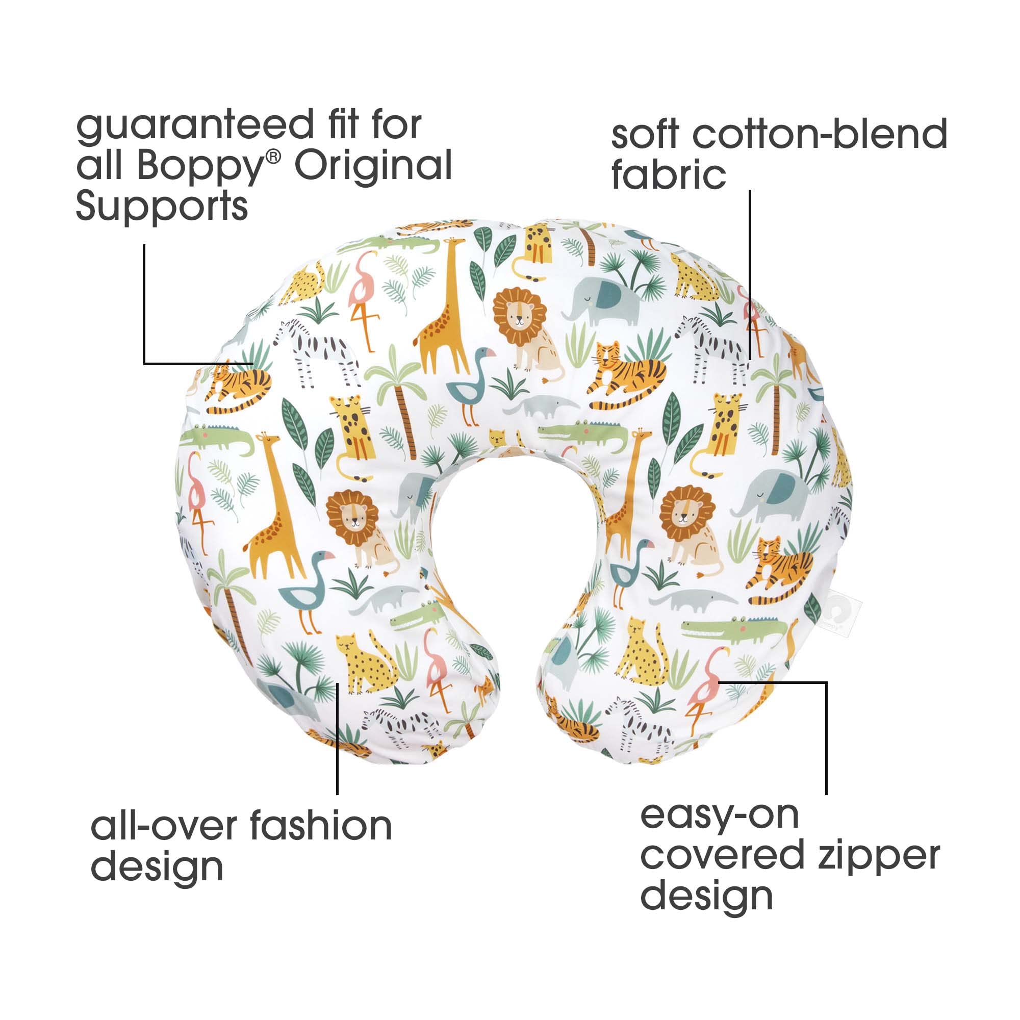 The Boppy nursing pillow bundle includes two essential accessories to keep your feeding and bonding pillow fresh. The first component is a Boppy Original Nursing Pillow Liner that protects the inner pillow from spills and stains. This breathable, water-resistant liner fits snugly over the pillow, keeping it clean for longer between washes. The second component is a stylish Boppy Nursing Pillow Cover in a colorful wildlife print. This soft cotton blend cover fits all original Boppy pillows and makes swapping out covers quick and easy. With the protective liner and extra cover, you'll always have a clean surface ready for your feeding and bonding sessions. The liner and cover are designed specifically for Boppy's original nursing pillow, ensuring a perfect fit. Both machine washable accessories extend the time between washing your pillow, meaning less laundry. Together these components help keep your Boppy clean, stylish and ready to support you and baby during special feeding and awake bonding times.