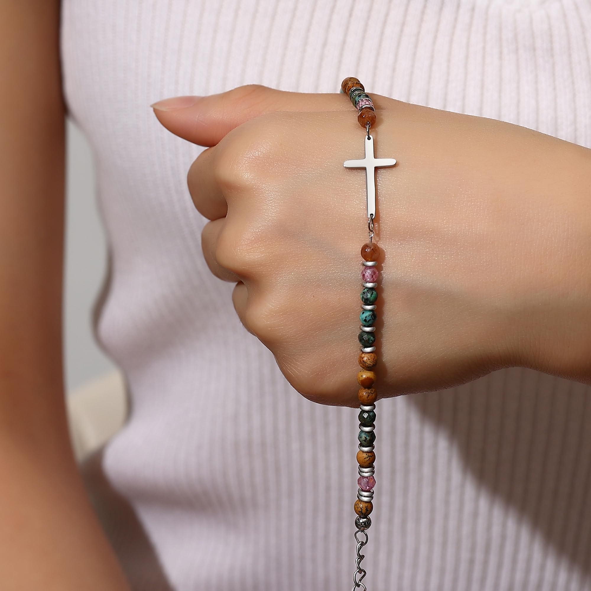 【 Premium Quality & Adjustable Size 】Crafted for comfort and durability, this 7.4" beaded cross bracelet for women features a 1.5" extension chain for an adjustable fit (6.5"-8" wrists). Handmade with 4mm colorful natural stones and hypoallergenic 316L stainless steel beads, it's lightweight, tarnish-resistant, and perfect for daily wear. The stones offer symbolic meaning while the cross adds spiritual protection—a meaningful fusion of faith and artistry.