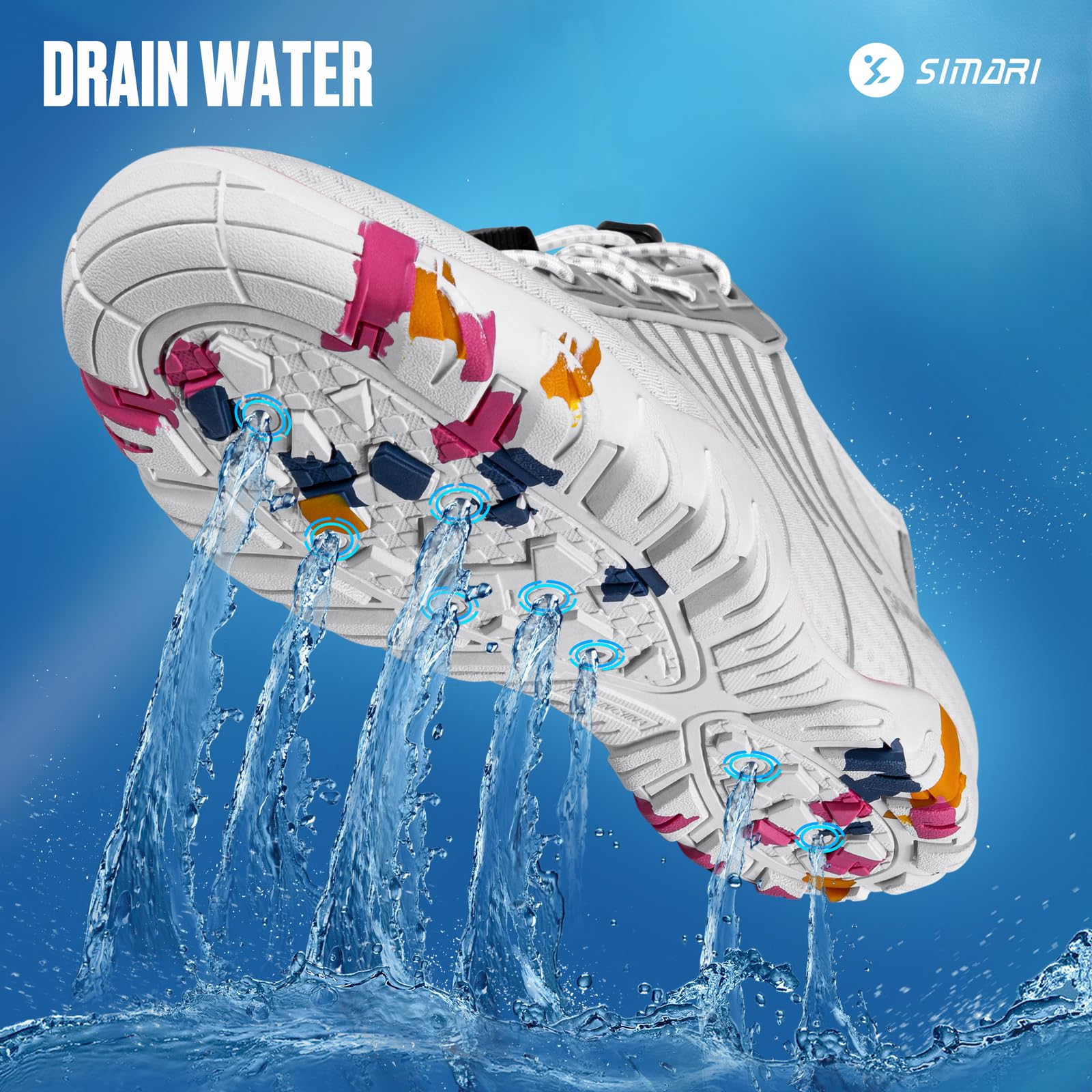 Quick-Dry Swim Shoes with Drainage Holes: 360° Drainage System, Water drains instantly through soles and insoles. The air-mesh fabric dries faster than regular pool shoes—perfect for diving, wakeboarding, canyoneering, cruise travel and water aerobics.