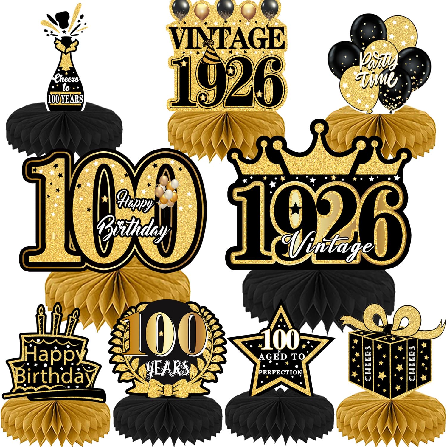 【100th Birthday Decorations Kit】: Packing coming with Large 100th Birthday Banner x 1pc, Big Gold 100th Birthday Balloons x 1set, Black and Gold Table Cloth x 1pc, Black Glittery with Gold Foil Words Happy 100th Birthday Sash x 1pc, 100th Happy Birthday Cake Topper x 1pc, Gold Number 100 Candles x 1set. This Value Black and Gold Party Decorations Set Meet Your Every Needs and Expects in 100th Birthday Milestone