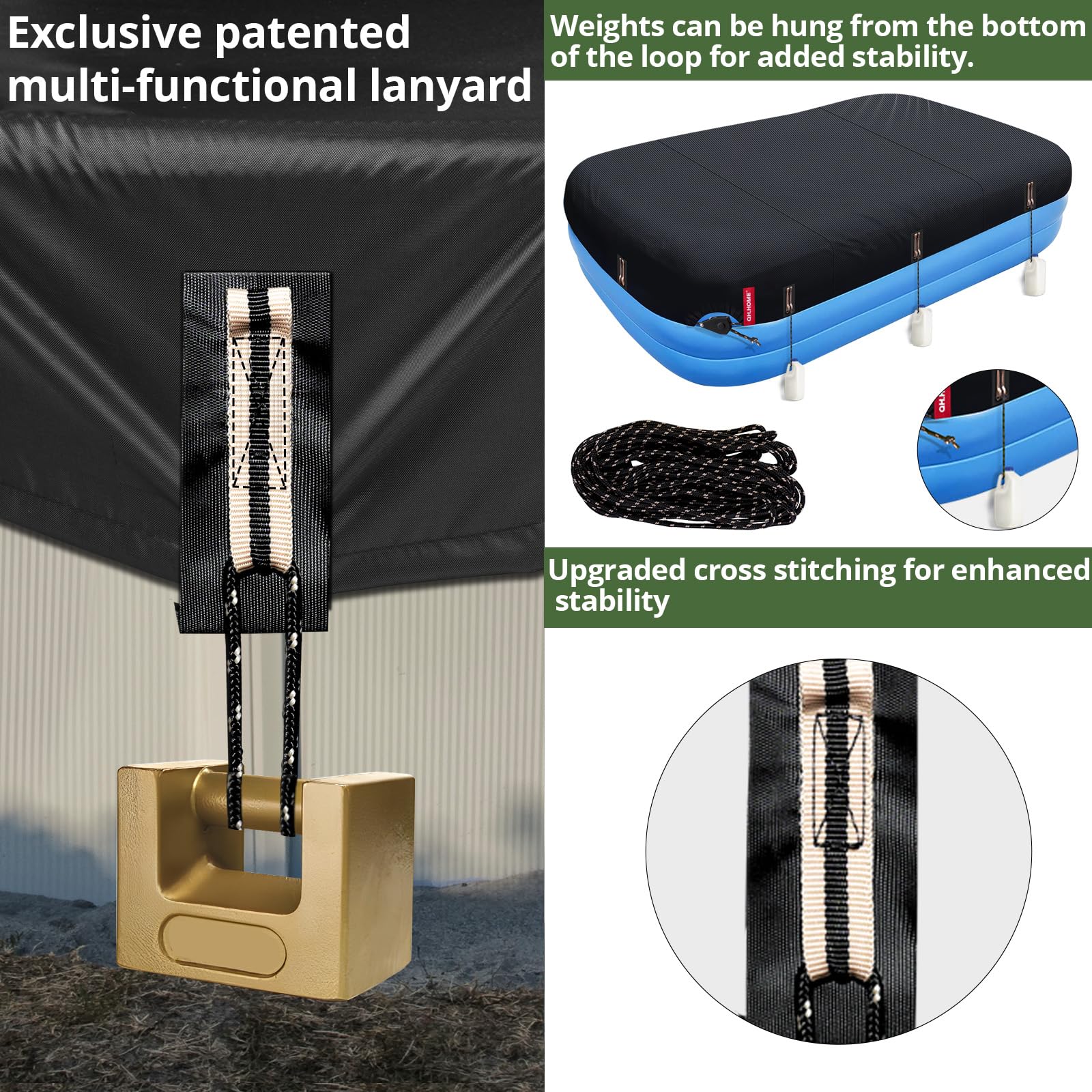 【UV Protection&Insulation】 PU-coated 500D fabric blocks 99% of UV rays (UPF50+ certified), protecting the pool water and cover from sun damage and preventing algae growth. Black fabric absorbs heat to raise water temperature by 8-12 degrees Fahrenheit during the day while reducing nighttime heat loss by 95% - dual-mode climate control that outperforms silver-coated pool covers.