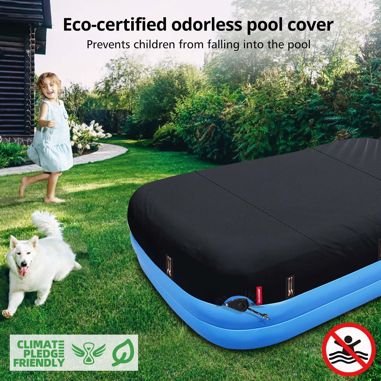 【Safer & Eco-Friendly Material】Our pool cover is Amazon Friendly Climate Certified and made of odourless, eco-friendly PU clear material that is safe for children and pets in hot environments, won't melt or leave a black residue, and is safer and more environmentally friendly than traditional PVC. Let you and your family enjoy the whole summer.