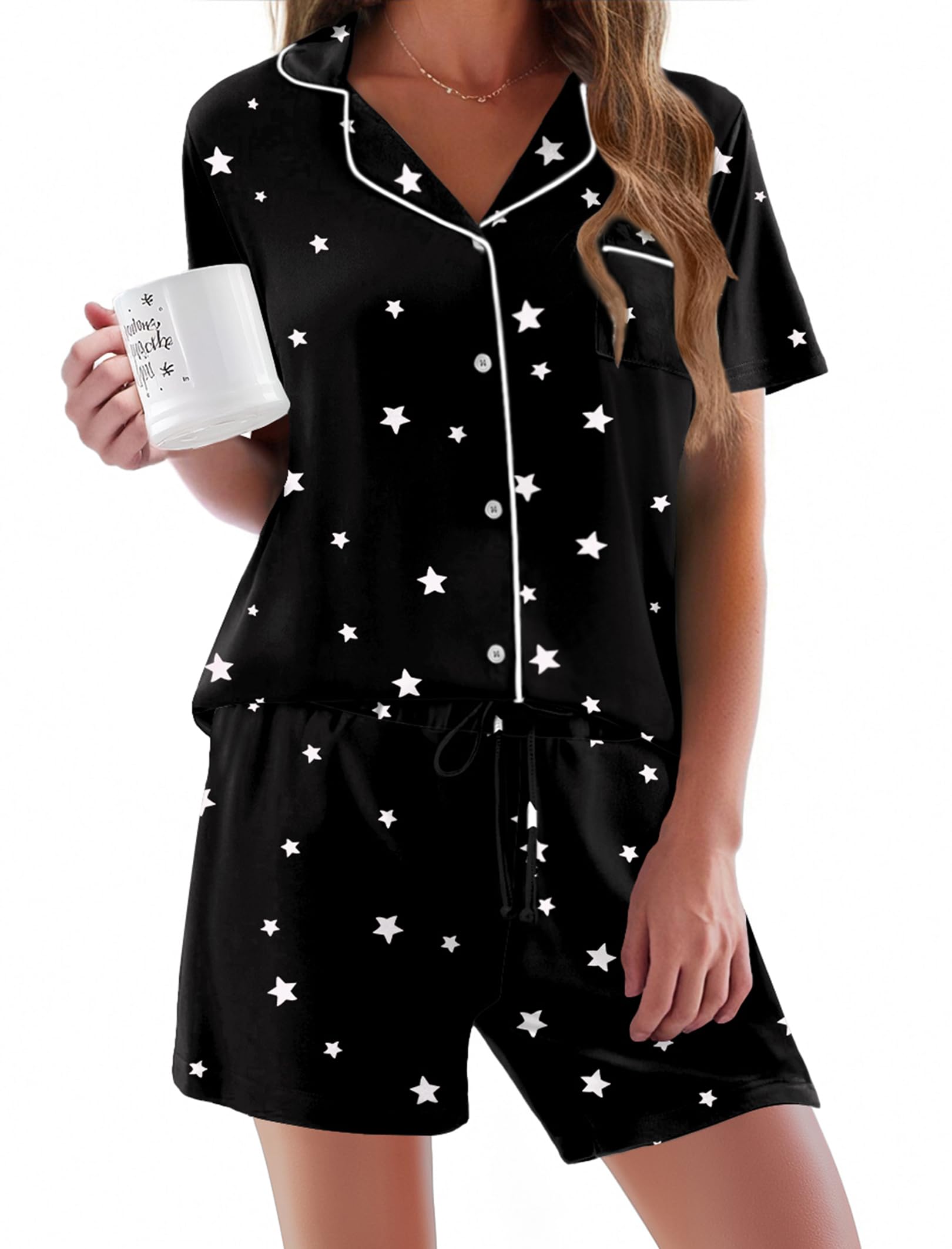 FEATURES: pajama sets for women 2 piece, pj sets for woman, V neck women's pajama sets, short sleeve T-shirt, drawstring elastic waist shorts.