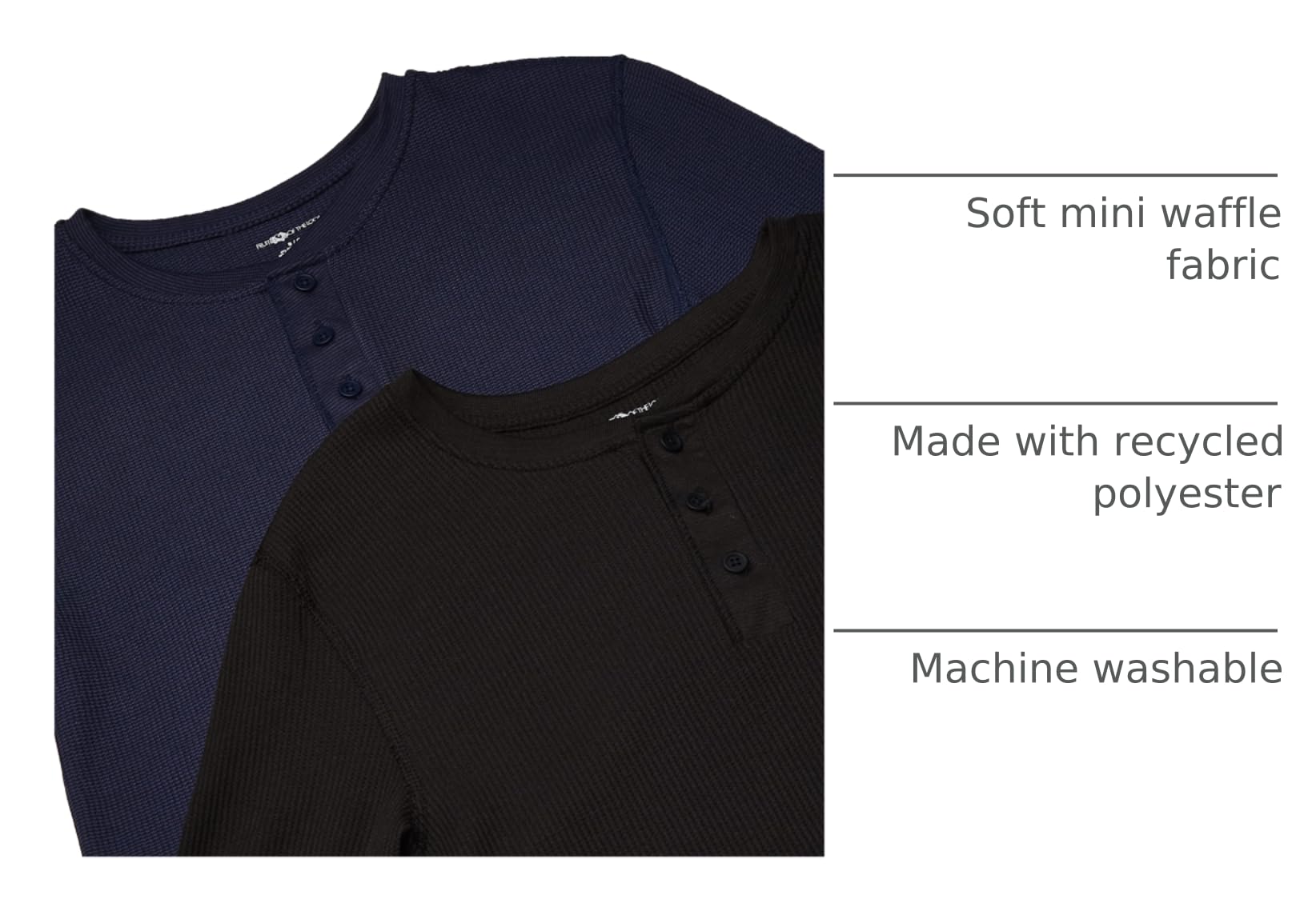 Description Stay warm and comfortable all season long in the Fruit of the Loom Menβs Recycled Waffle Thermal Underwear Henley Top. Crafted from a soft blend of U.S.-sourced cotton and recycled polyester, this eco-conscious top combines sustainability with everyday comfort. The mini waffle knit fabric naturally traps body heat to help retain warmth, while moisture-wicking technology keeps you dry during active or cold-weather wear. Designed for performance and comfort, this long sleeve henley features flat seams to reduce chafing, rib-knit cuffs to seal in heat, and a tag-free neck label for irritation-free wear. The fitted construction layers smoothly under jackets or sweaters without adding bulk, making it ideal for work, outdoor activities, or relaxing at home. Available in 1- and 2-pack options, this thermal henley top is a versatile, essential piece for your cold-weather wardrobe.