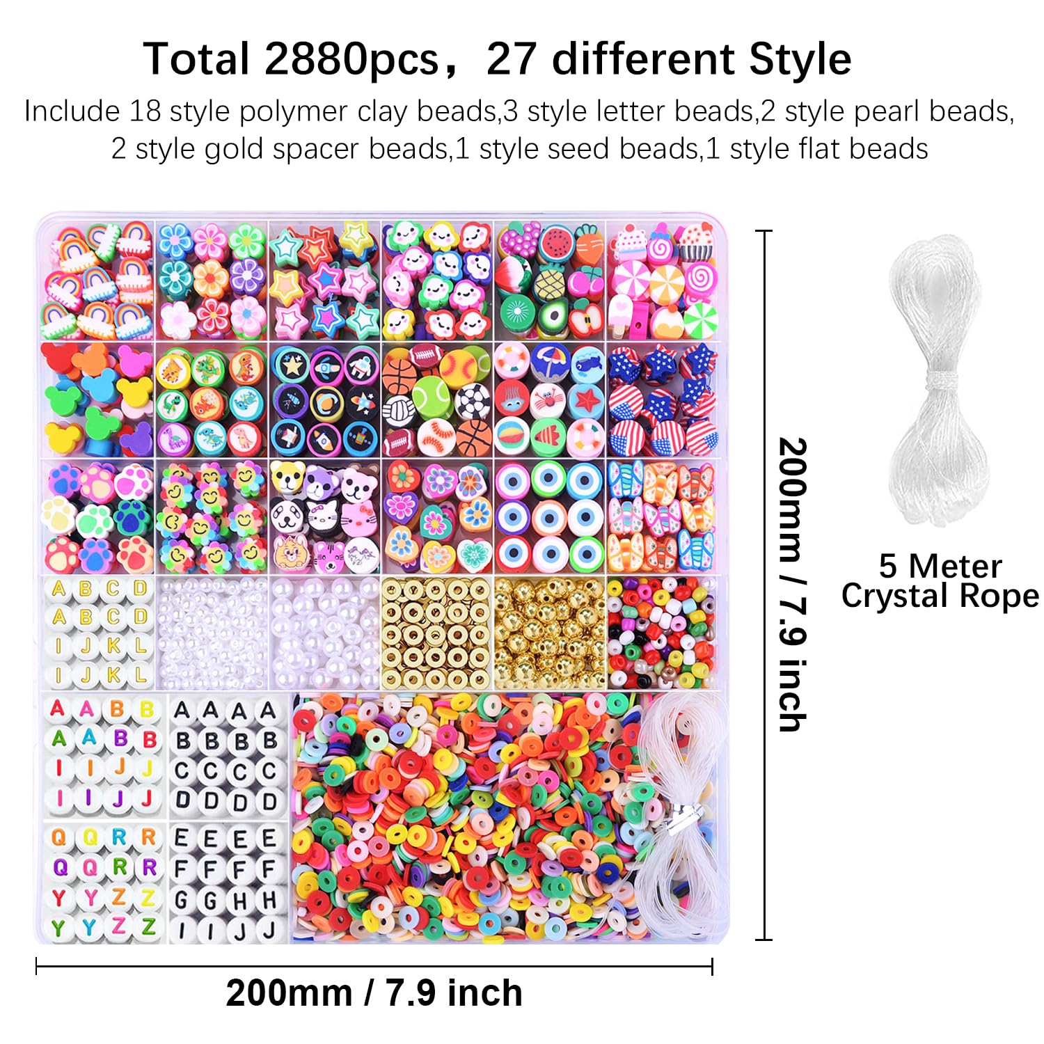【2880PCS BRACELET MAKING KIT】Include 1 storage box, 27 different styles Bracelet Making beads,contains pony beads, flat round beads, opaque letter beads,colorful letter beads,white letter beads,gold letter beads,peal beads,flat gold spacer beads,round gold spacer beads, rainbow, flower, pentagram, cloud, fruit, candy, mouse head, dinosaur, universe, football, basketball, volleyball, rugby, ocean series, national flag, cat's paw, sunflowers, animals, love, eyes, butterflies beads etc and plus 5 meter elastic string, unique and creative to meet all needs.