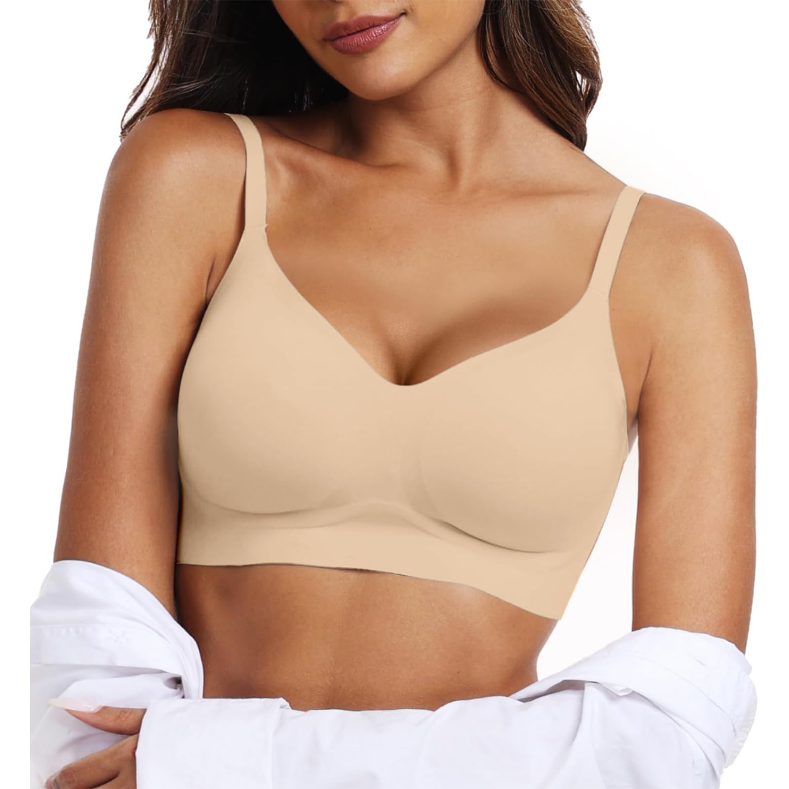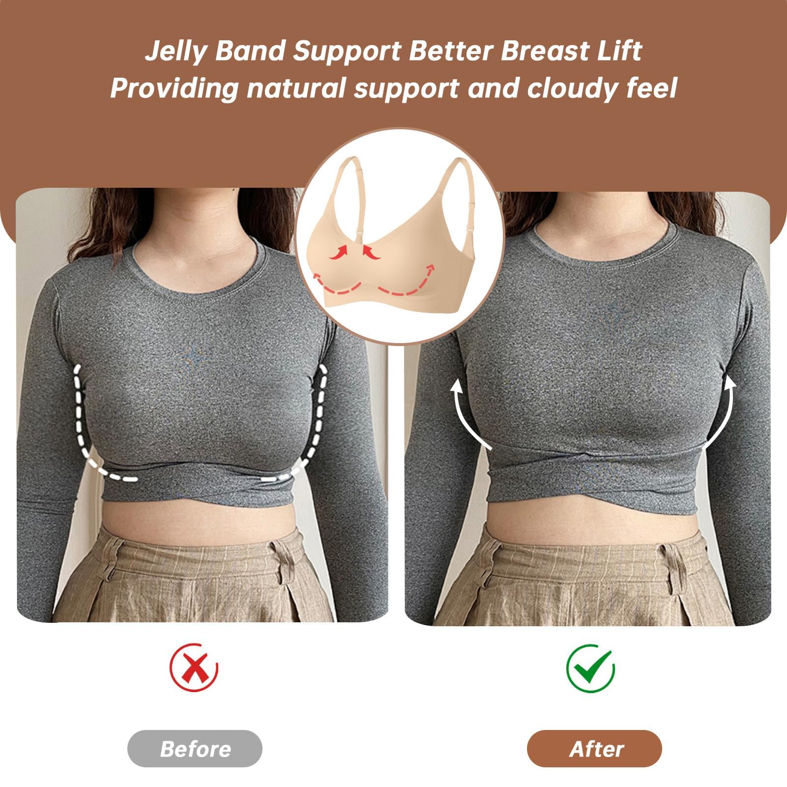 Comfortable Bralettes with Good Support - The Invisible Bra employs a professionally supportive design, offering excellent support to effectively wrap and support the breasts, reducing the possibility of sagging. With soft support bands and wide adjustable straps, it ensures the bras do not roll up when raising your hands. The side support of the Jelly band provides an ultimate fit and comfortable sensation, offering tension support to your arms.