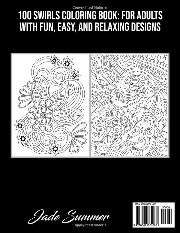 Beautiful Patterns for Relaxation Enjoy coloring wonderful patterns and symmetrical designs. This easy coloring book includes a variety of relaxing and easy-to-color designs for adults and teens. Bring these pages to life with beautiful colors! 100 Unique Images. Beautiful full-page pattern designs on single-sided pages. For Adults and Teens. Great for anyone who loves floral designs and symmetrical patterns. Relaxing Designs. Coloring helps with stress relief, calmness, and mindfulness. Easy-to-Color. This easy coloring book is great for all skill levels. Hours of Creative Fun. Many wonderful designs so there is always something fun to color. Get your coloring supplies ready and make 100 Swirls part of your Jade Summer collection!