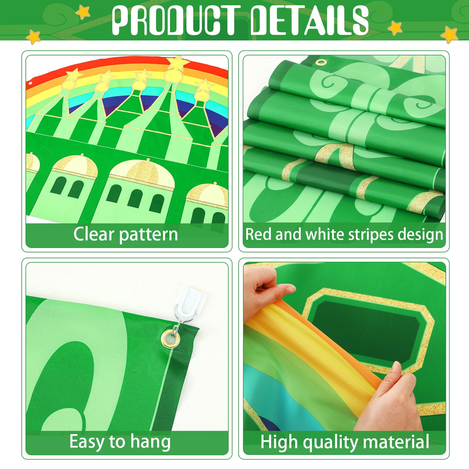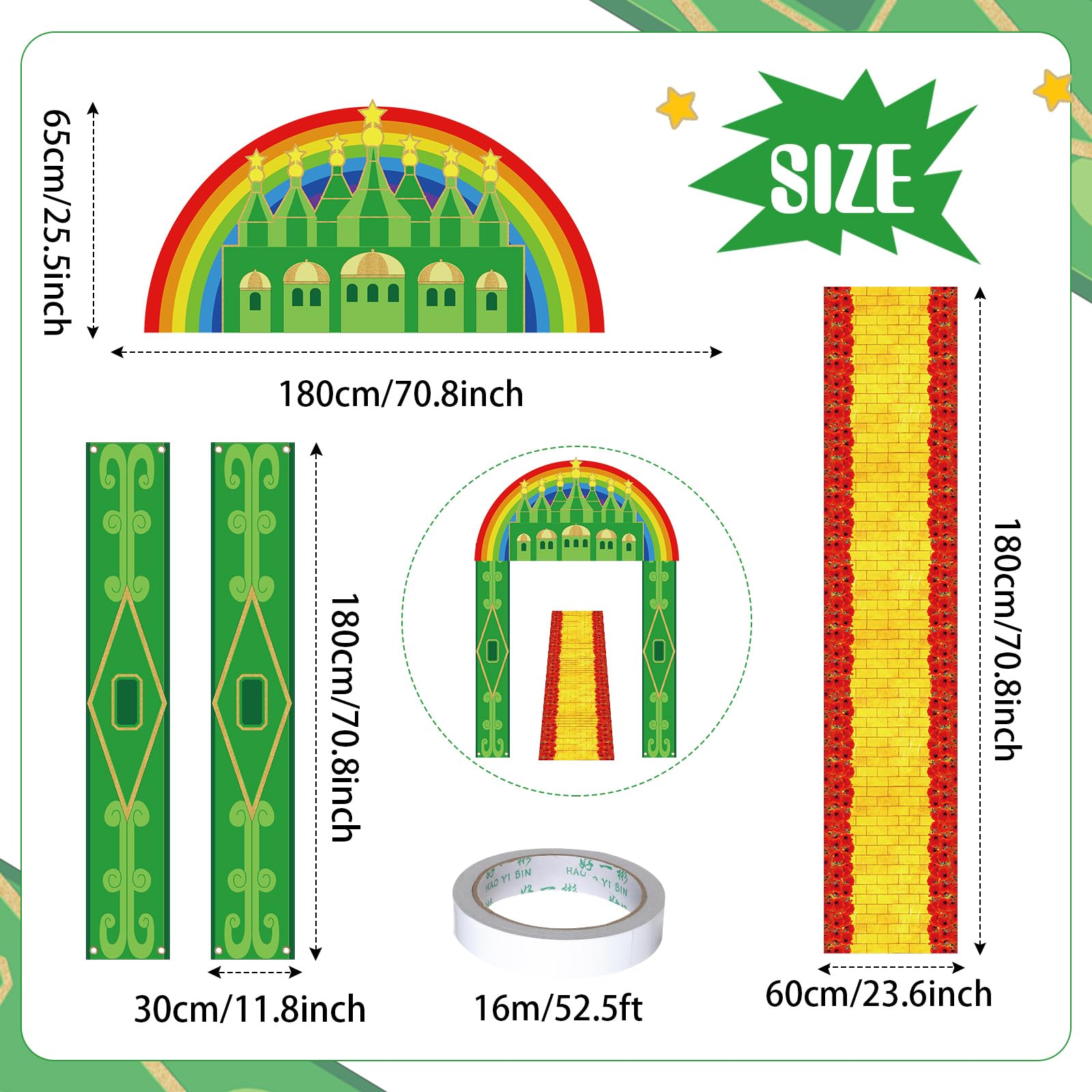 Ideal Sized: the Emerald green Castle porch signs is approx. 71 x 12 inches/ 180 x 30 cm, and the Emerald green Castle hanging banner decorations are approx. 71 x 35.4 inches/ 180 x 90 cm, Emerald green Castle yellow brick floor with poppy entryway is approx. 118 x 23.6 inches/ 300 x 60 cm, enough size allows you to apply it at parties with confidence, let your party attract attention