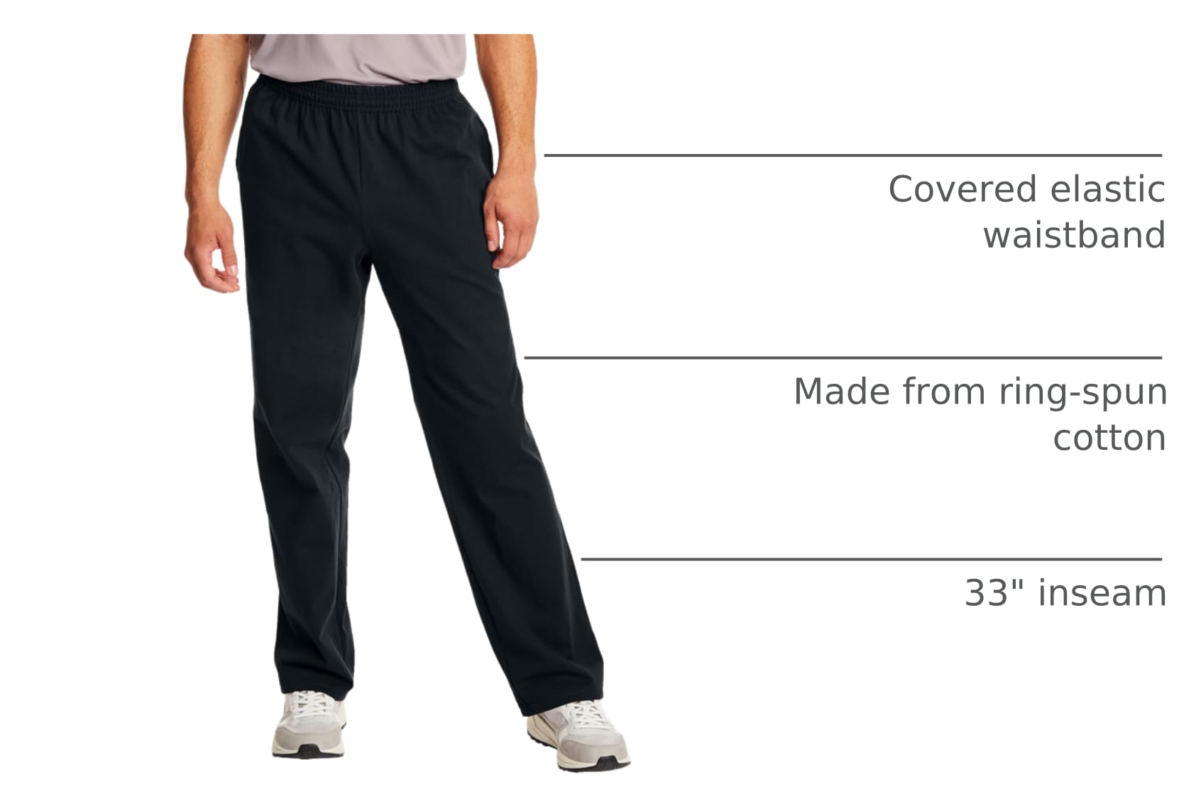 Description Heat up or chill out with Hanes Essentials jersey pants that transition from work-out to loungewear mainstay. Crafted from cotton (heathers are a cotton blend), these open-bottom menβs lounge pants will soon become your everyday go-to. Details like robust double-needle stitching at the leg openings, covered elastic waistband with interior drawcord, and convenient side-seam pockets make them a versatile rotation favorite. Top with your favorite Hanes tee for a look that works at the gym, running errands, or just relaxing with friends. And hereβs the best part - these menβs pants are made from cotton responsibly grown on U.S. Farms.