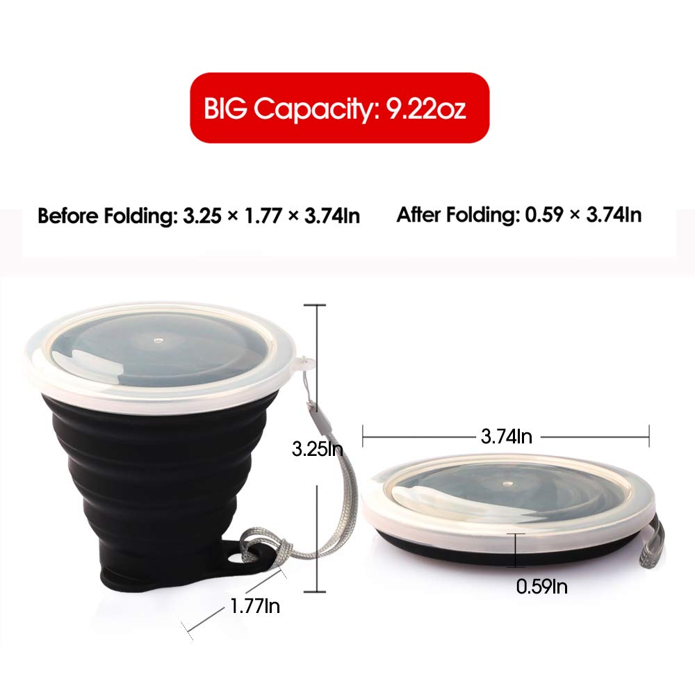 Size Information: The capacity 9.22oz(270ml). Before folding, the Top diameter 3.74In, Bottom diameter 1.77In & Height 3.35In. After folding, the Height only 0.59In, temperature range from -40F to 480F. The small collapsible volume and light weight made them both of these use for home and outdoors.