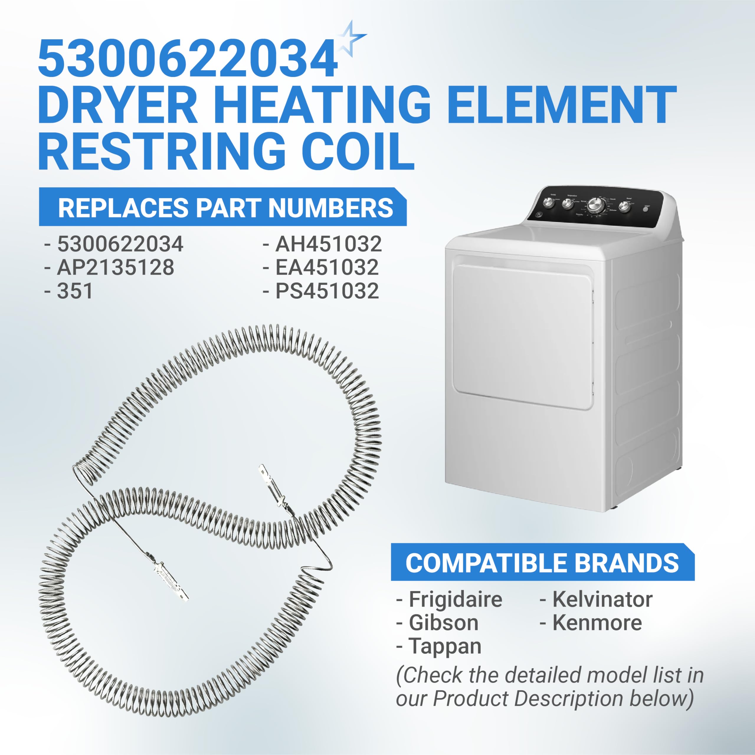MODEL NUMBER: 5300622034 Dryer Heating Element Restring Coil with 5/16 Inch Terminals.